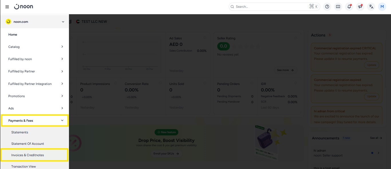 - In the Seller Lab, click on the Payments & Fees section in the navigation bar and then click on Invoices & Credit Notes to view and manage your documents.