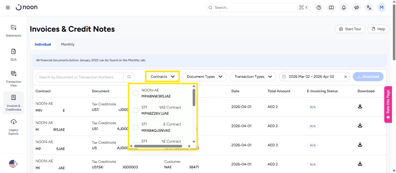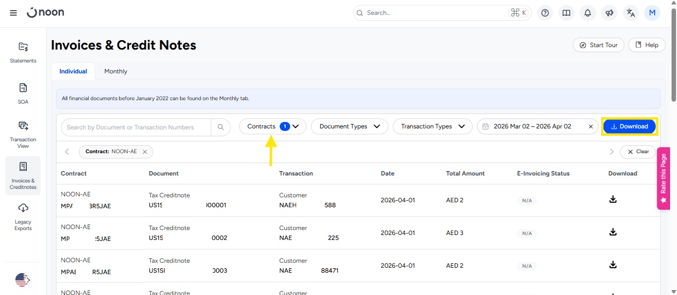 Download individual documents for record-keeping and reconciliation. You can select a contract and then click on Download.