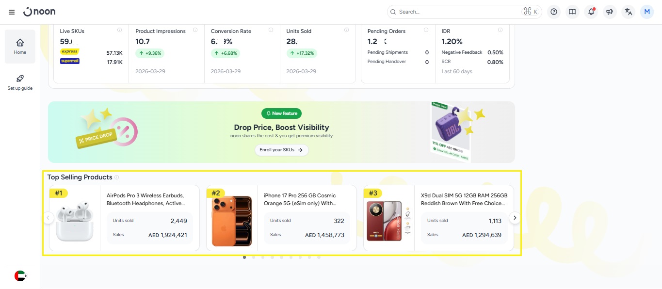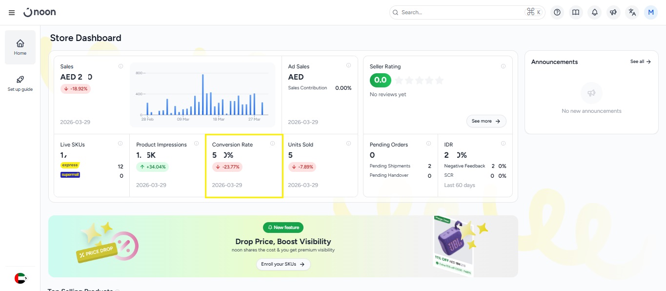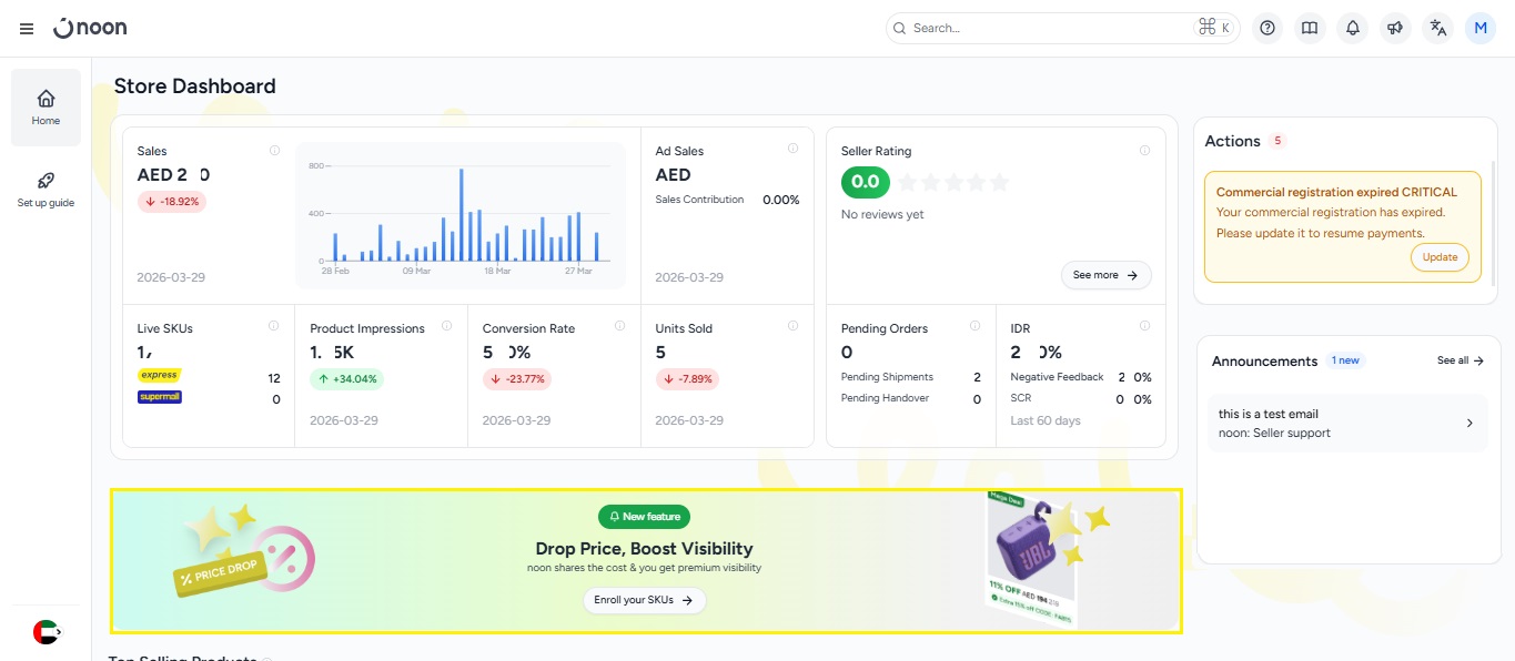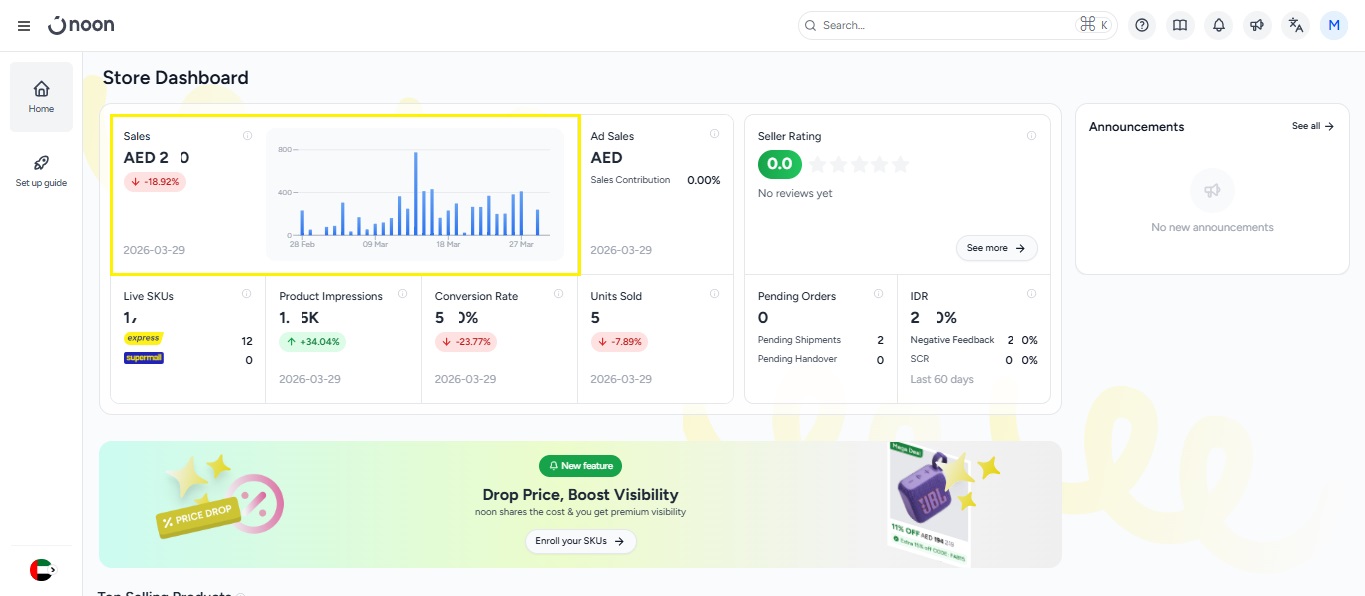 The Store Dashboard in Seller Lab provides a comprehensive snapshot of your business performance on noon. Designed to highlight key metrics and urgent tasks, this centralized hub allows you to monitor your growth and take immediate action on what matters most for your seller journey.