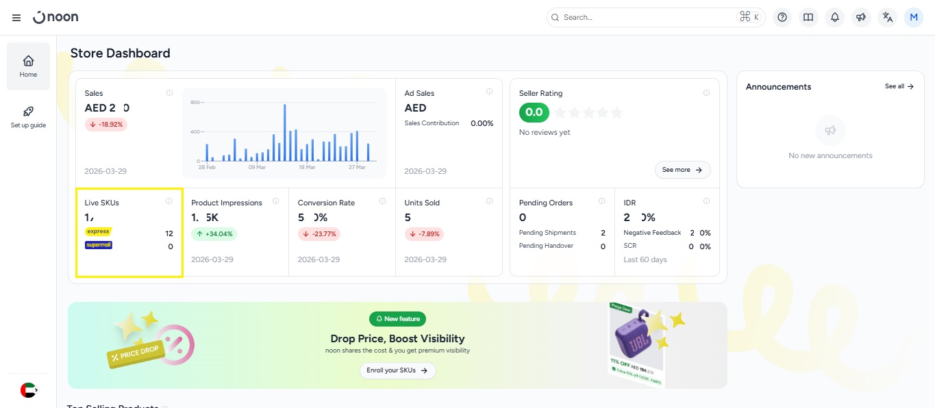 Live SKUs: This section displays the total number of products currently visible to customers, including a breakdown of Express SKUs (those carrying the noon express tag) and supermall SKUs (SKUs live on supermall).