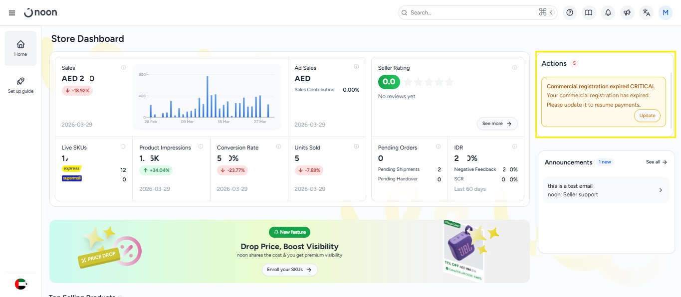 Actions: This section highlights Critical Actions (e.g., document expiry) that require immediate attention to keep your store active, as well as General Actions (e.g., onboarding tasks) to maintain account health.