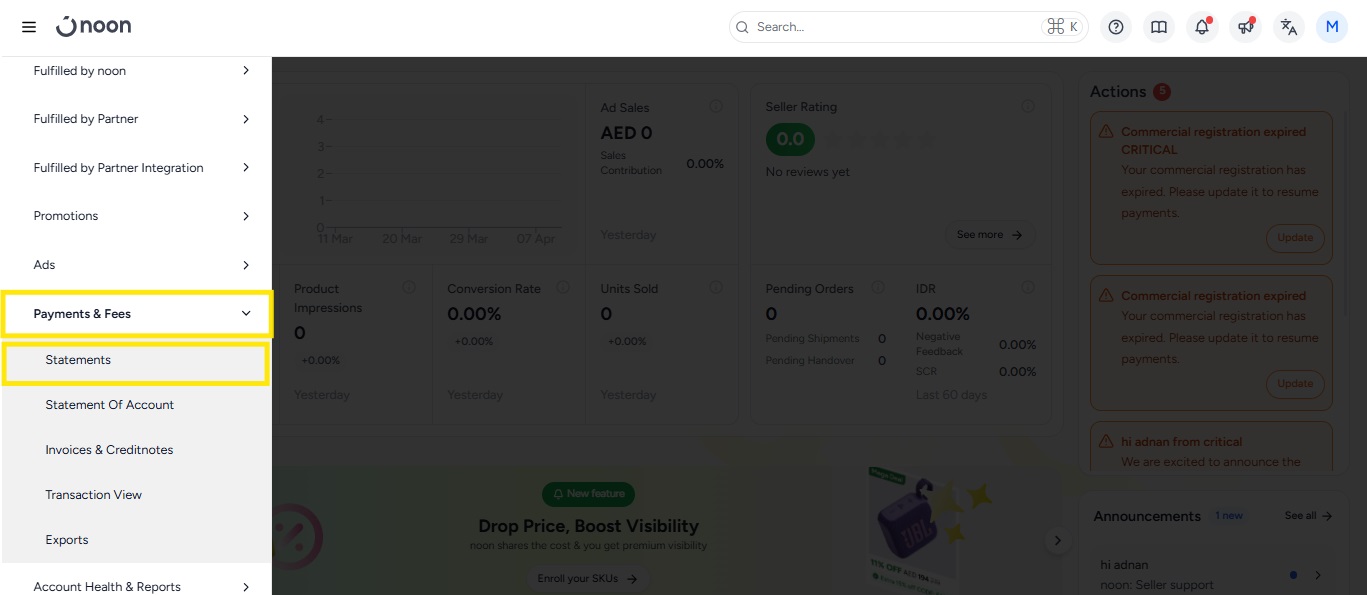 Monthly storage fee | SKU/ Pbarcode | A monthly service fee applied to each item stored in noon warehouses. The fee calculation is based on product dimensions and the number of storage days. |
