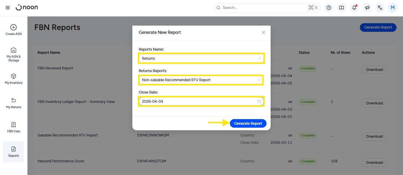 To help you avoid Non-Saleable Item Storage Fees and manage your non-saleable inventory efficiently, Noon provides the Non-Saleable Recommended RTV Report. This report details non-saleable items stored in Noon fulfillment centers that are eligible for retrieval or removal. This guide explains how to access the report and provides a detailed breakdown of the columns included.