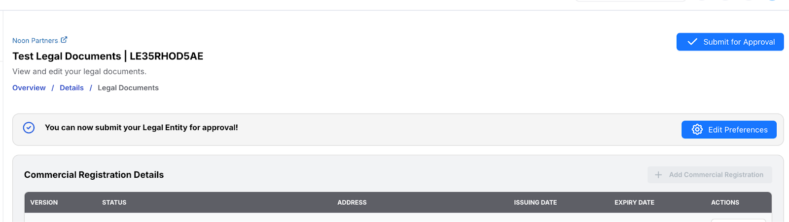 The status of your legal entity will show Submitted for approval.