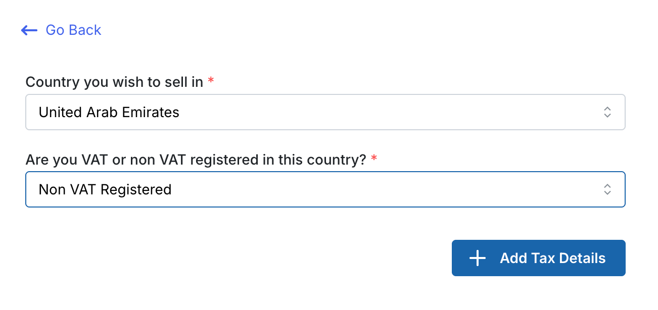 You now need to add Tax details. First, select the country you want to do business in and then select “Non VAT Registered”