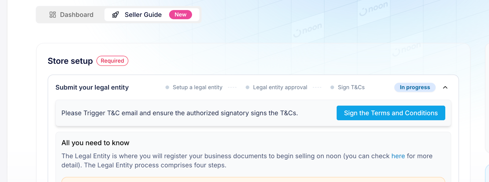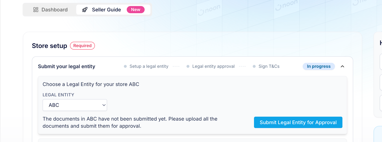 Alternatively, you can navigate to the same section through the Seller guide by clicking on ‘Create Legal Entity’ available to you on the seller guide page