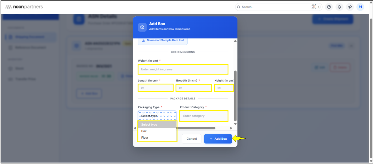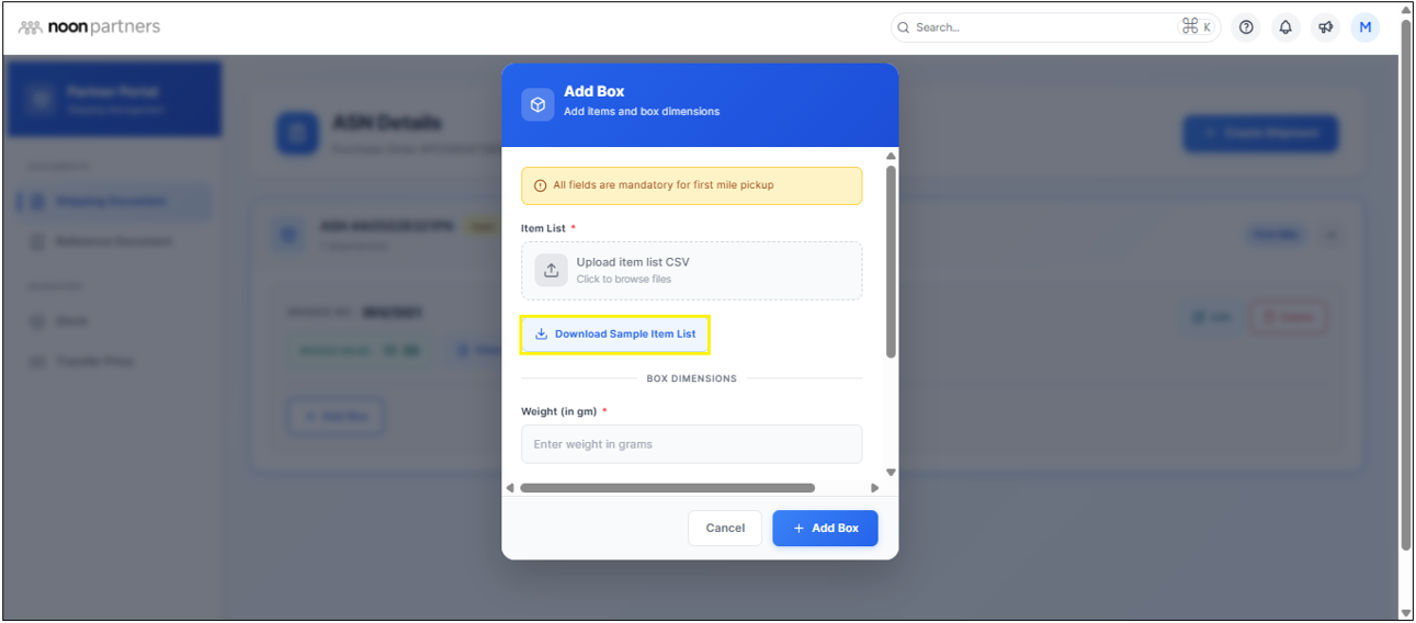 - Then you are requested to provide box dimensions and weight if you selected the first-mile pickup option. Then click on Add Box.