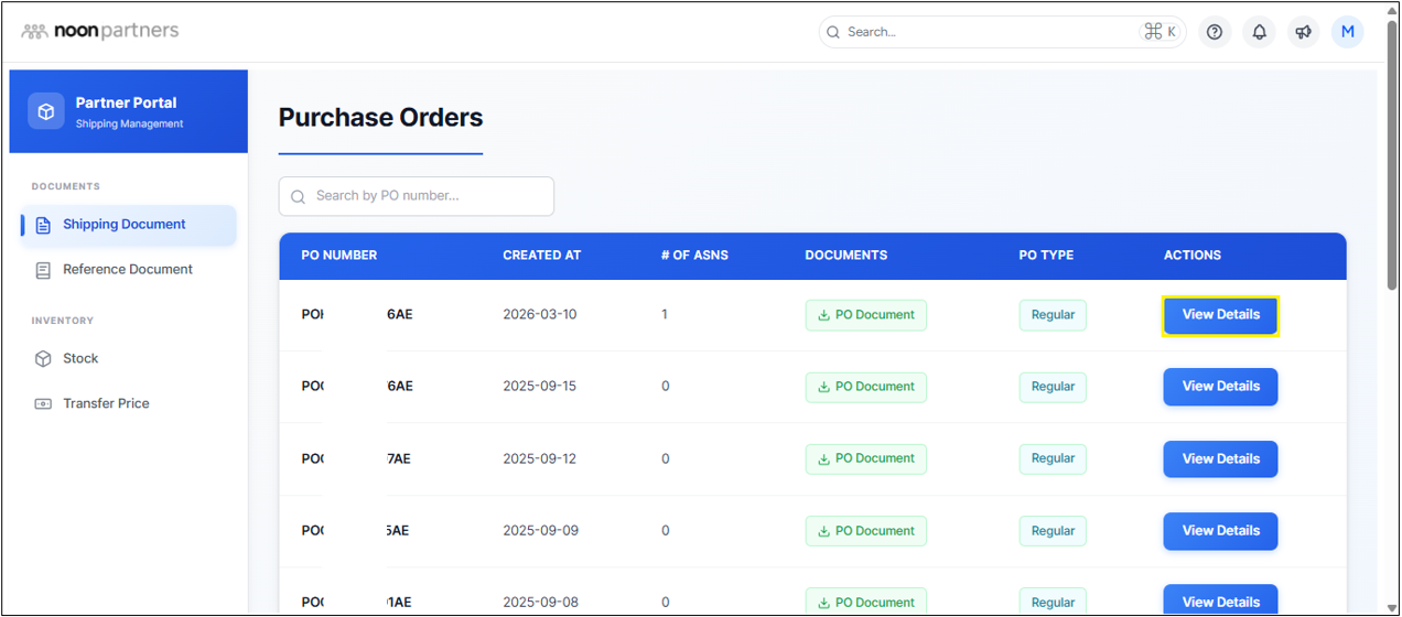 - Click on Shipping Document in the left-hand menu. Click View Details on the relevant PO.
