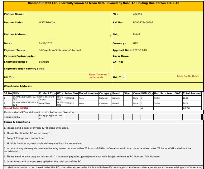 noon sends a Purchase Order (PO) via email every day for all new orders. This document contains the list of products requested, quantities, and pricing.