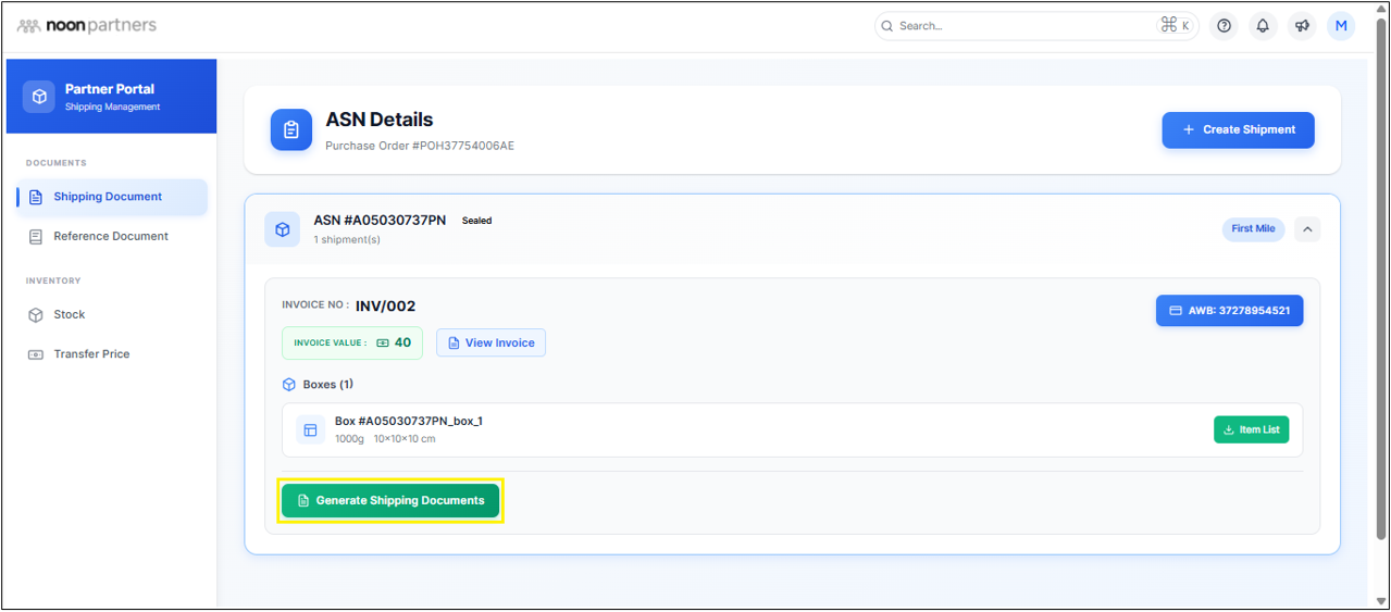 - Once the Shipping Document is ready, you will see the green button Generate Shipping Document is activated.