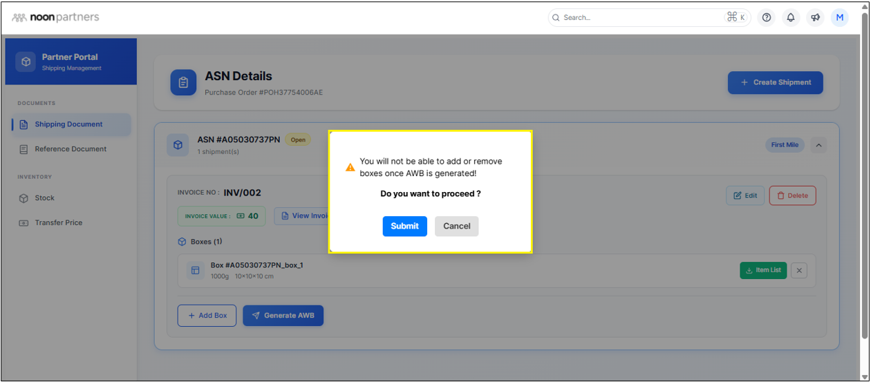 - You can click on Generate AWB to create a tracking number. A pop-up appears, which requests your confirmation to proceed further. The process of generating AWB will take 15-20 minutes.