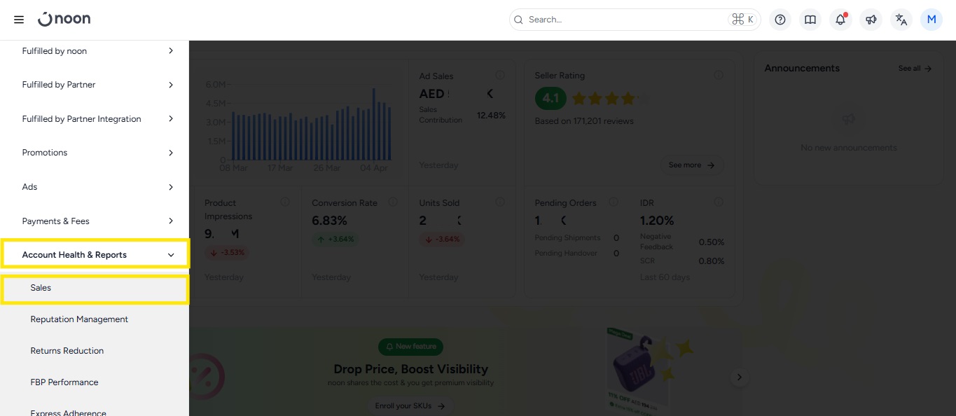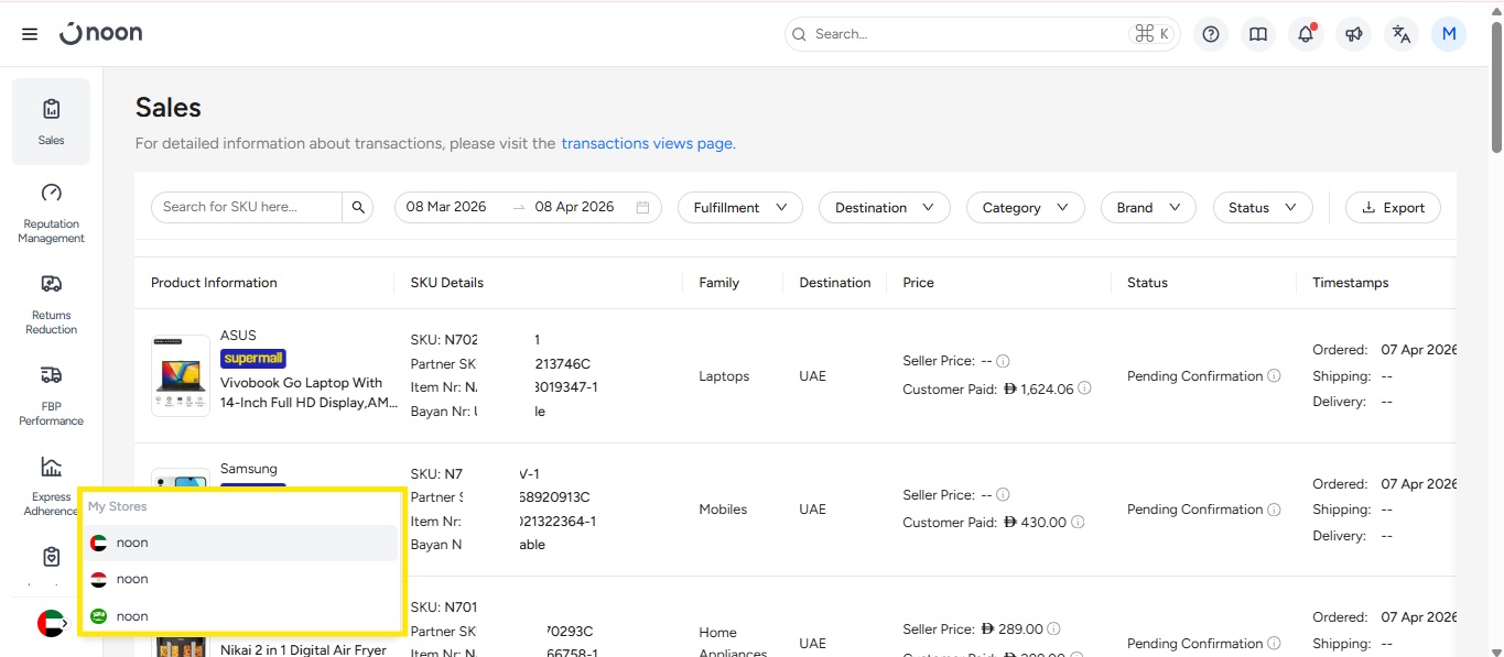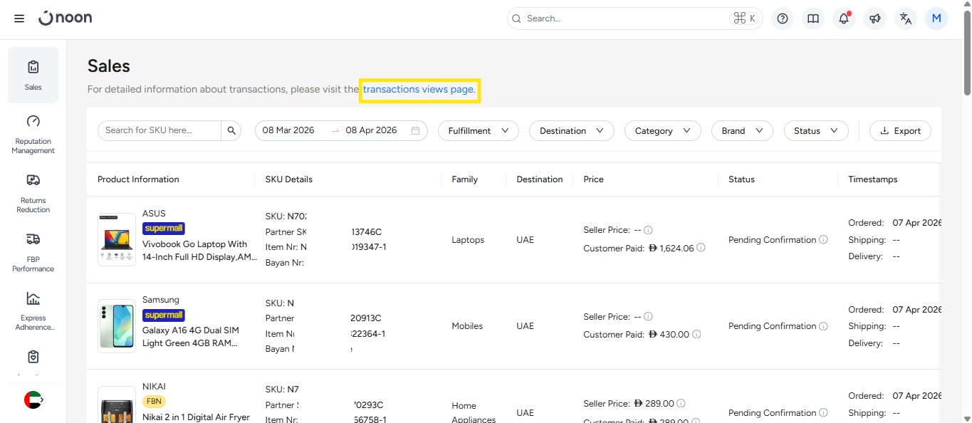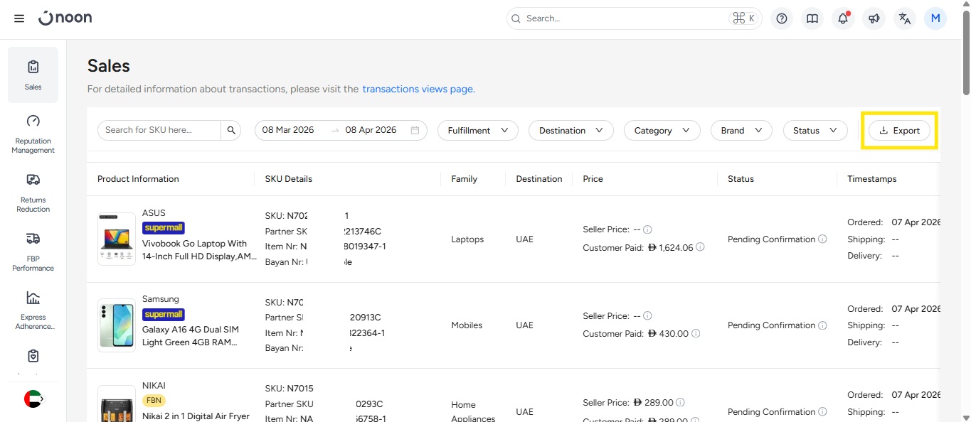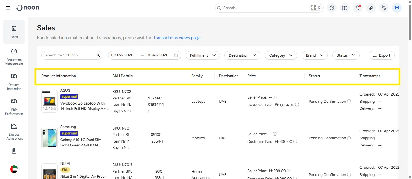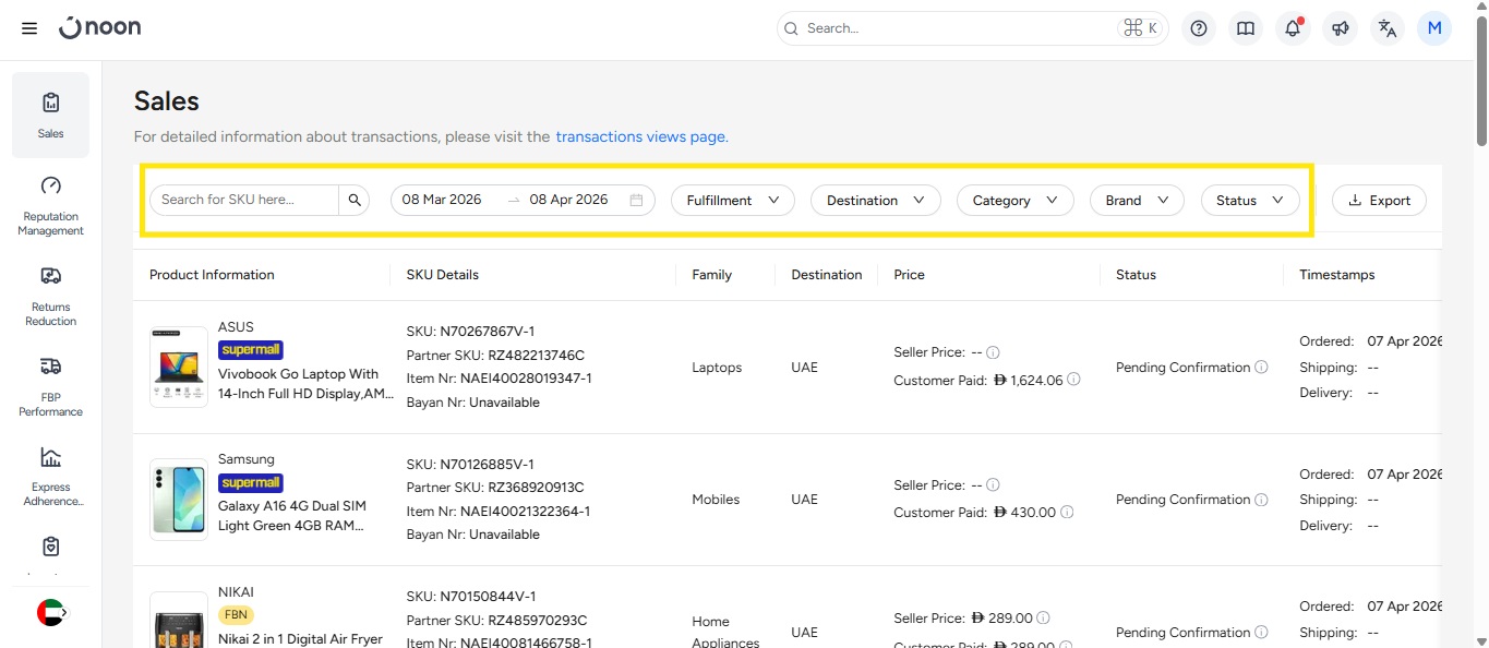The Sales View allows you to keep track of all of your sales and payments through noon. Once an item is dispatched to the customer, it will be visible in this view. This page includes sales under all selling models, whether Fulfilled by noon, Fulfilled by Partner, or Supermall.