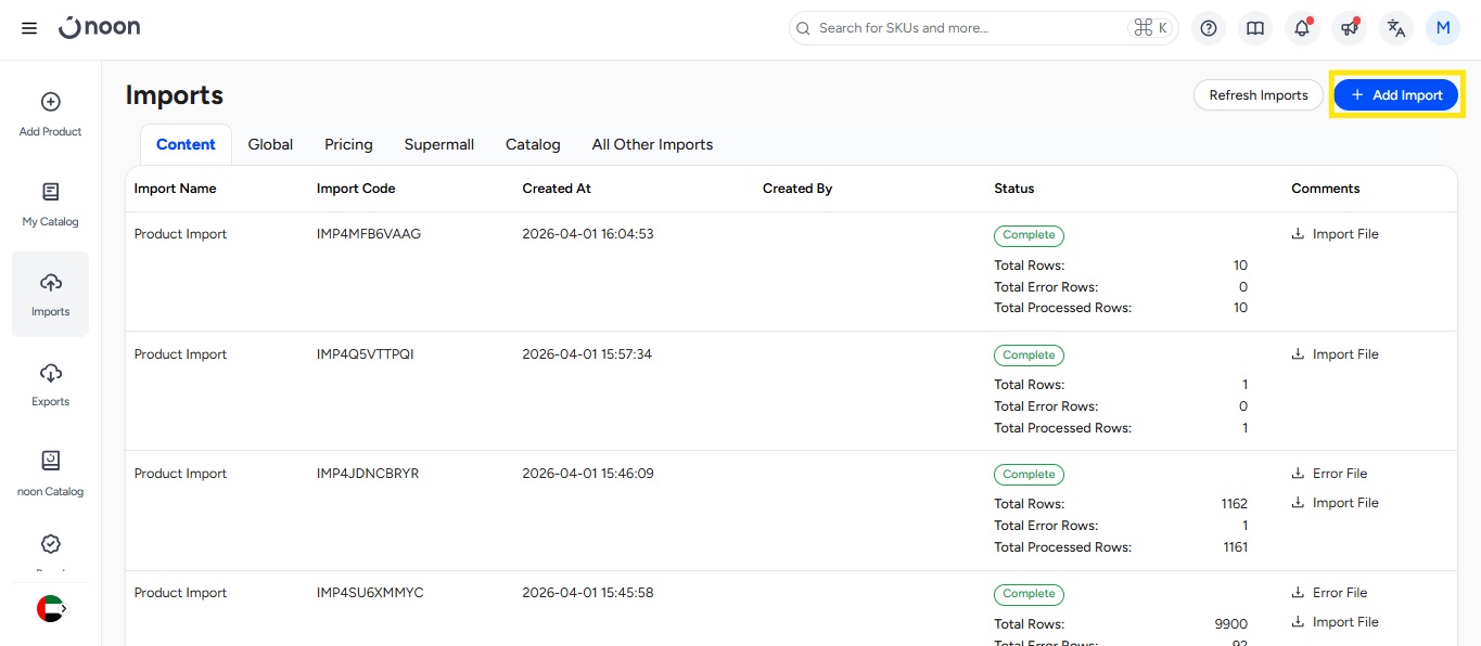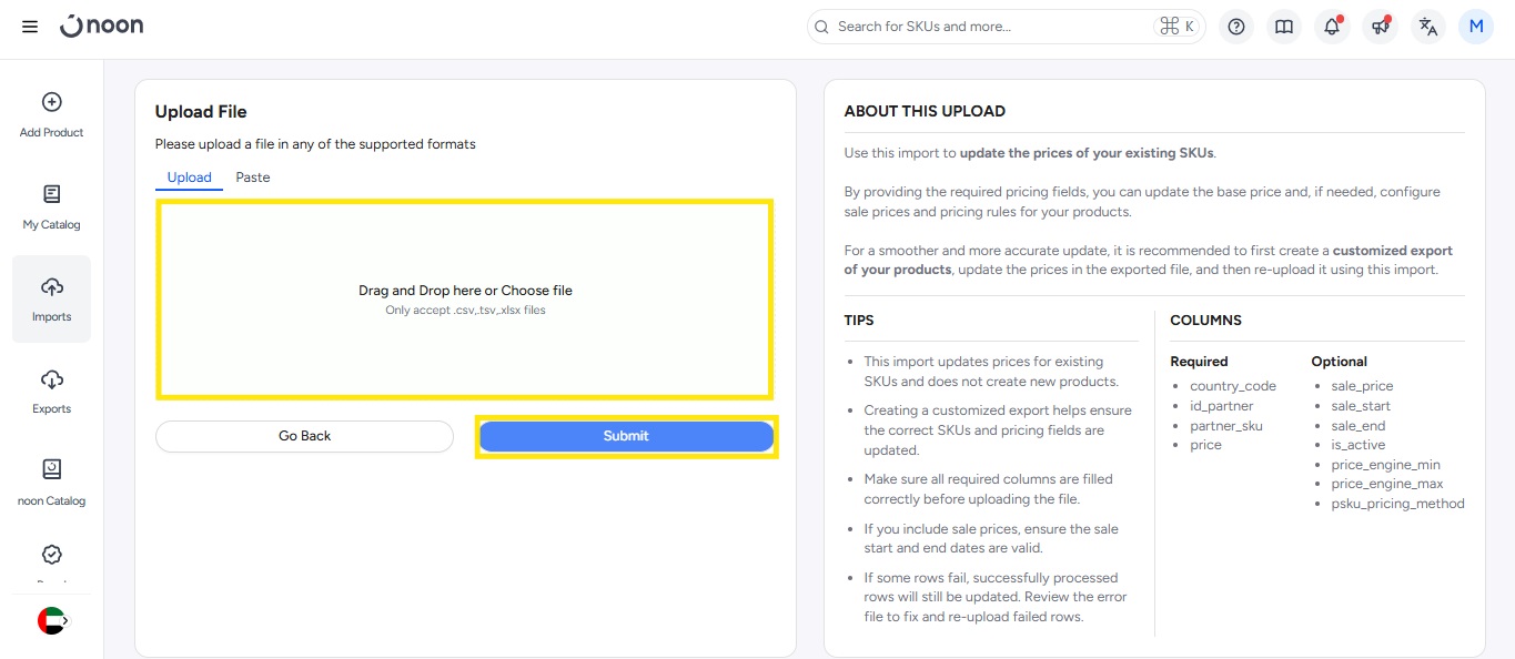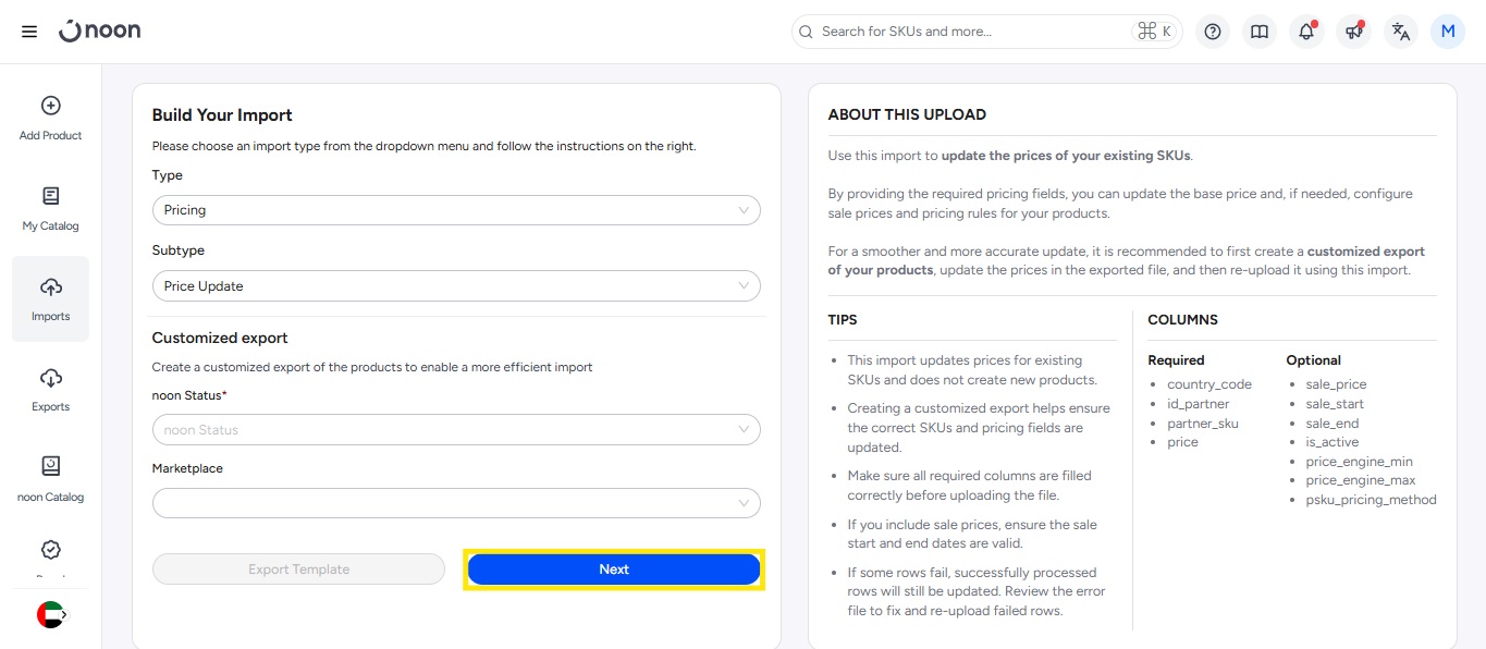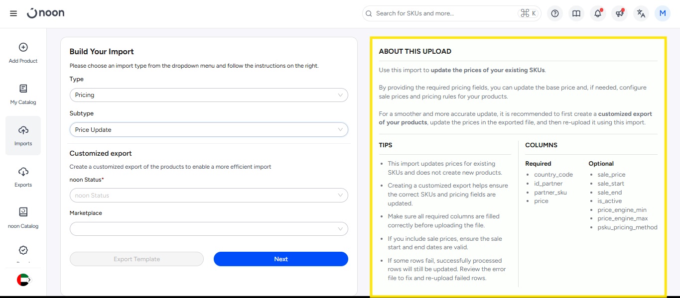 You might find extra columns when you download the sample template, like X_noon_sku, Noon_warehouse_code, etc., those are optional fields and you can learn more about all fields from the help center.