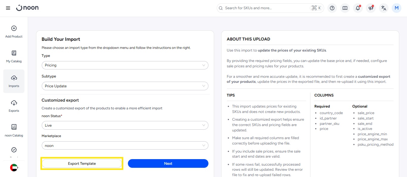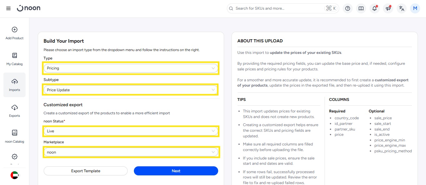 - Select Price as ‘Import Type’ then select Price Update as ‘Sub Type.’ To help you identify which SKUs to update, you can select between those that are Not Live or those that are Live under ‘Status’. You can then select your ‘Marketplace’ as noon.
