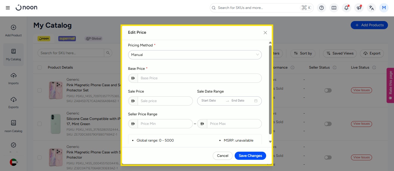 - Select the pricing method and update the price for the SKU. Any changes made to your offer will reflect immediately on the noon website. If you would like to add a Sale Price, you may also add this on the page with the necessary start and end dates for how long you would like the Sale Price to be live. If the Sale Price is added, it will take priority over your Price during its campaign. Click on Save to update the price.