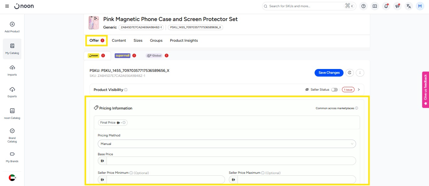 - You can also click on the SKU and update the price in the offer section.