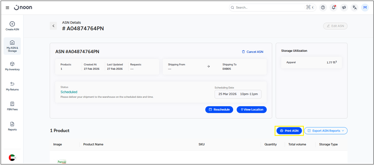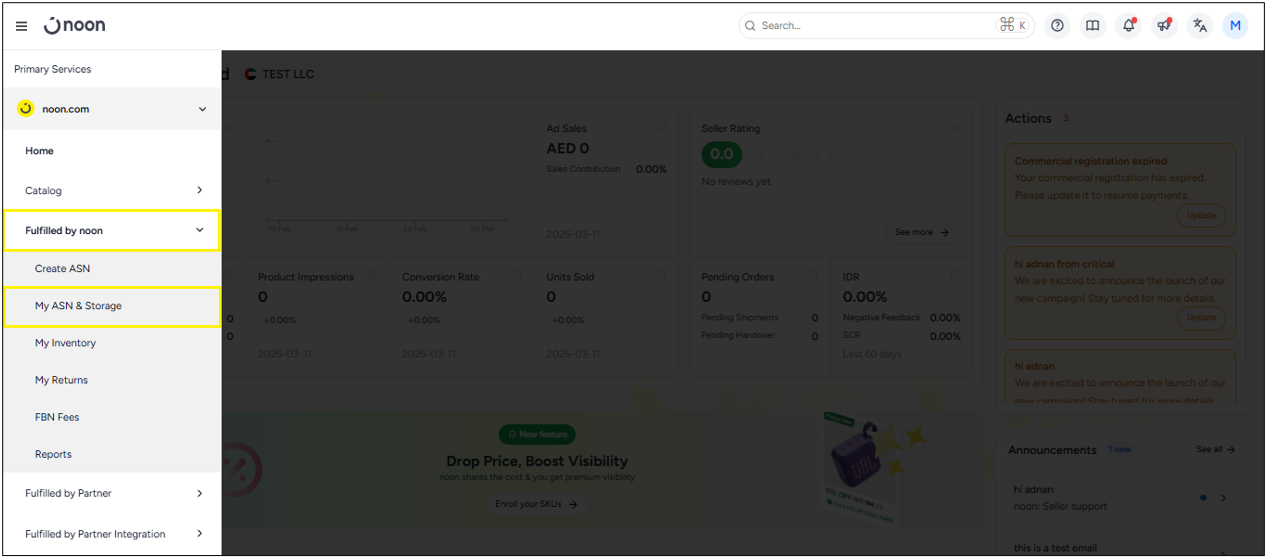 - Log in to Seller Lab, click on Fulfilled by noon option, and then click on My ASN & Storage.