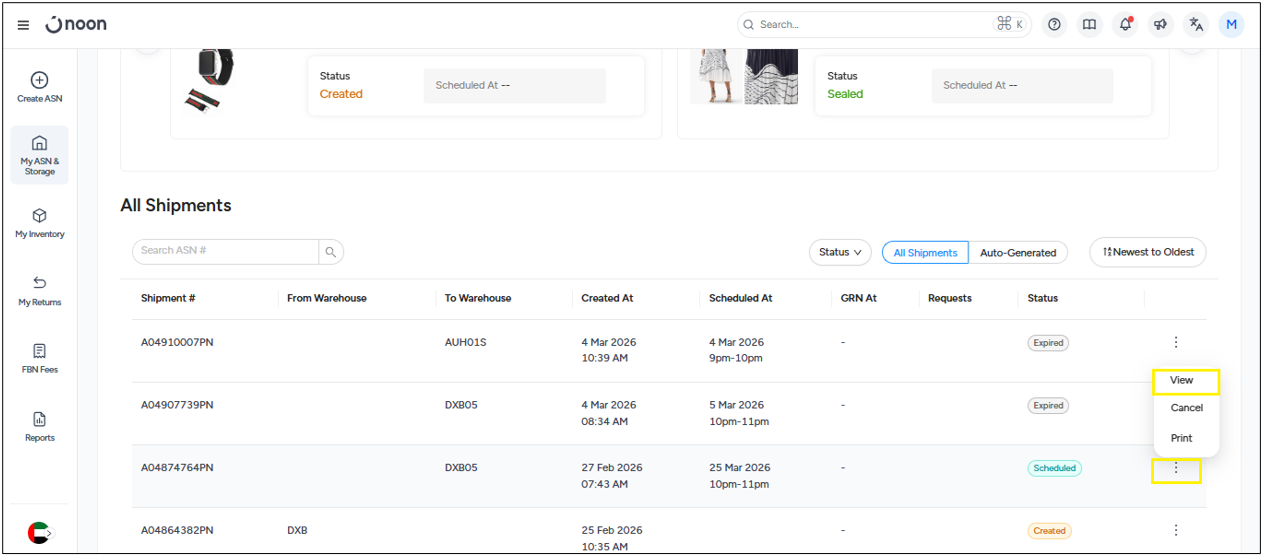 - In the shipments tab, scroll down to All Shipments and locate the ASN for which you need the document. Then click on the action button and click on view. You can also create the ASN if you haven't created one.