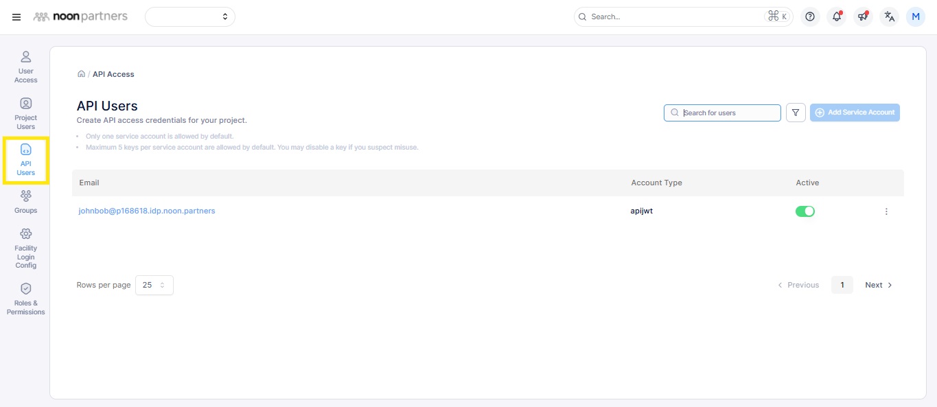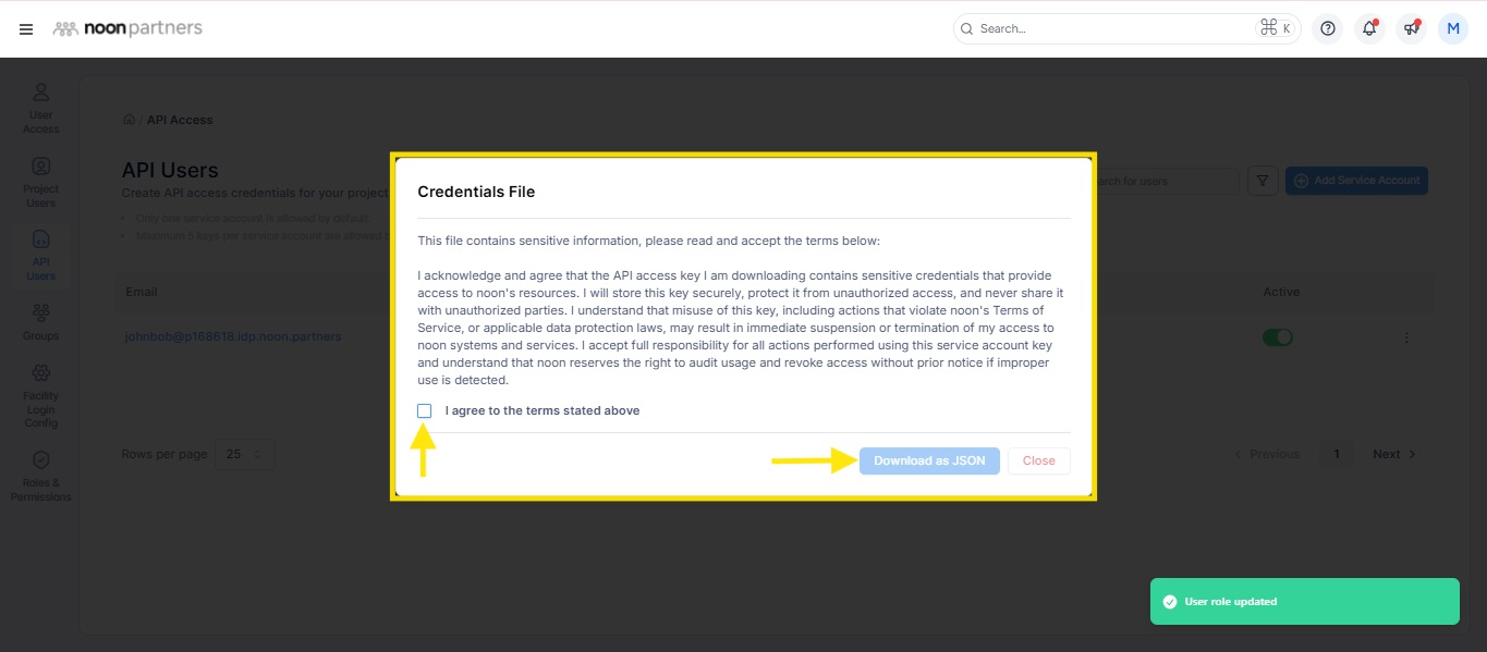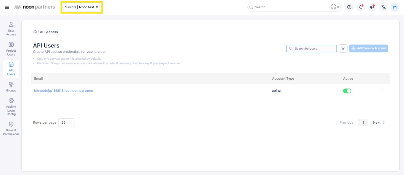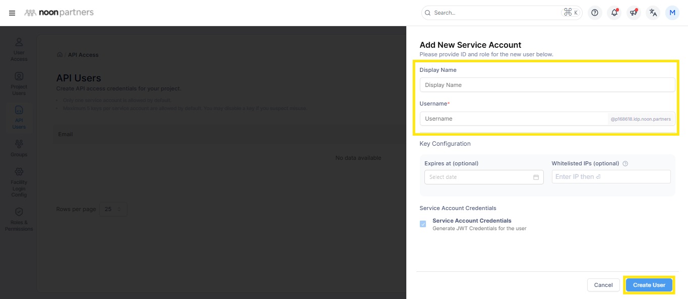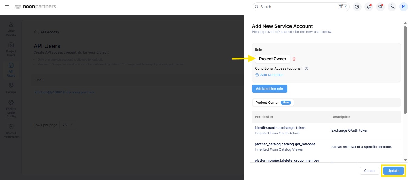 2. The username will be the username + @p1455.idp.noon.partners.- Role: You must select the Project Owner to ensure the integration has the correct permissions.