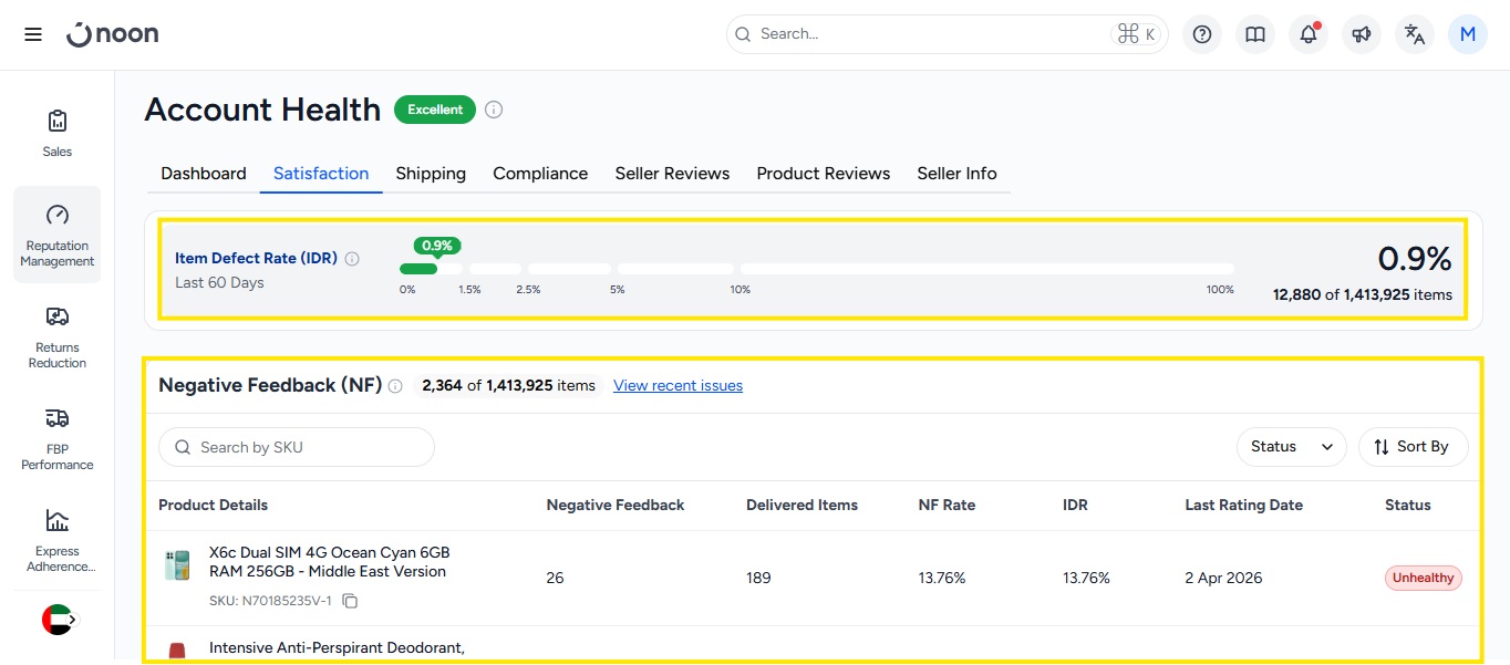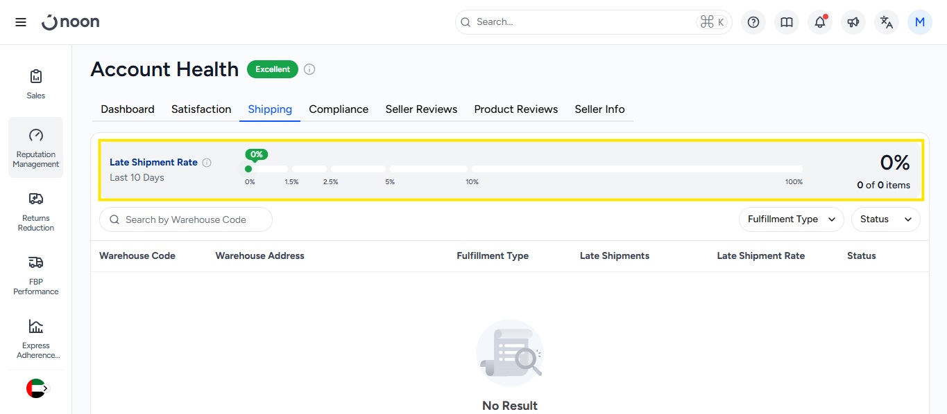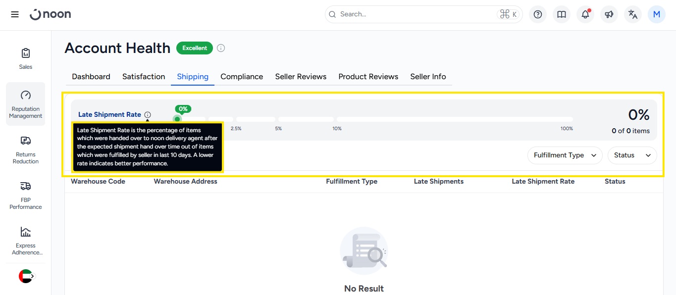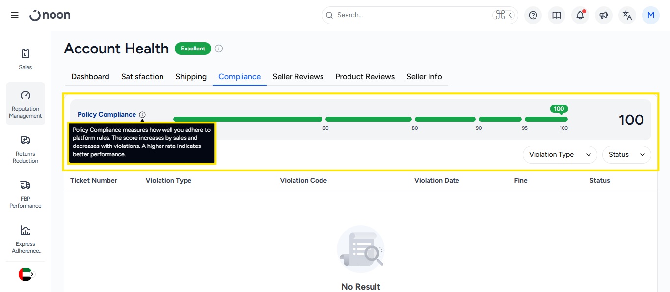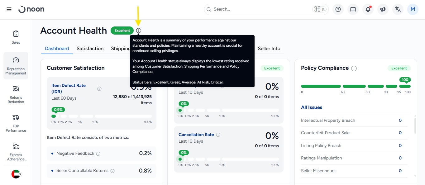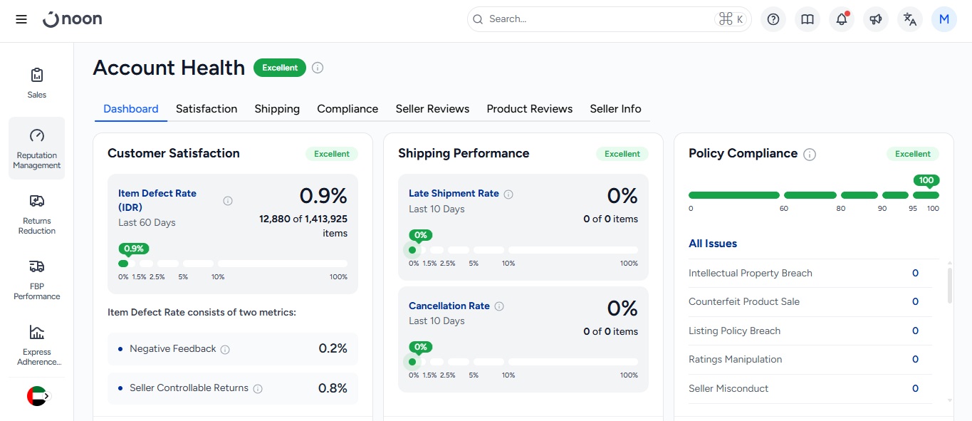 - How this metric affects you: This indicates that at least one among the Customer Satisfaction, Shipping Performance and Policy Compliance metrics may not be complying with noon’s policies, which puts noon, and its internal and external stakeholders at risk. This may impact your offer visibility on the platform and may even lead to account-level deactivation if no corrective action is taken.