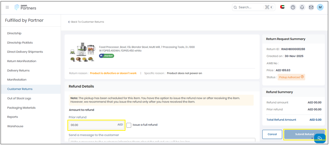 Details page, you can enter the amount agreed with the customer in the 'Refund