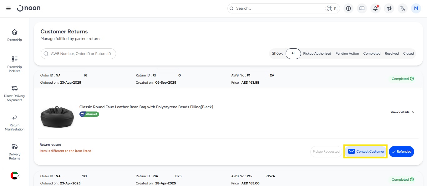you navigate to the Customer Returns page. Each return will have a “Contact