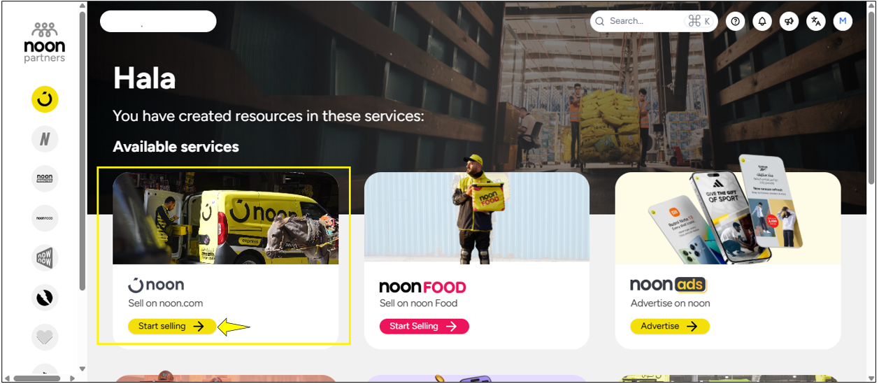 After creating your Organization ID, you’ll be directed to the Available Services page. Click on 'Start Selling' under sell on noon.com.