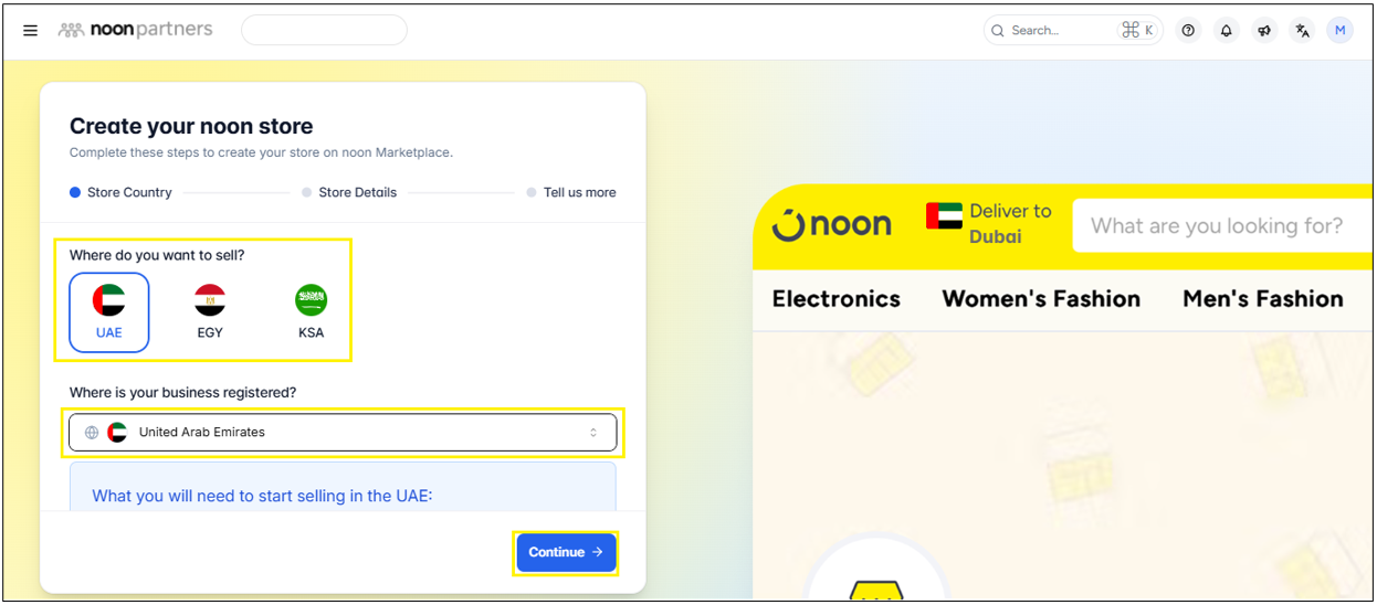 Select the Country where you wish to sell (UAE, Saudi Arabia, or Egypt).