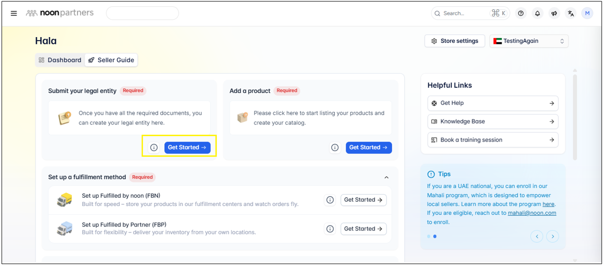 This will redirect to the Seller Guide, where you will see the option to Submit your legal entity. Click on the Get Started button to start your documentation process.