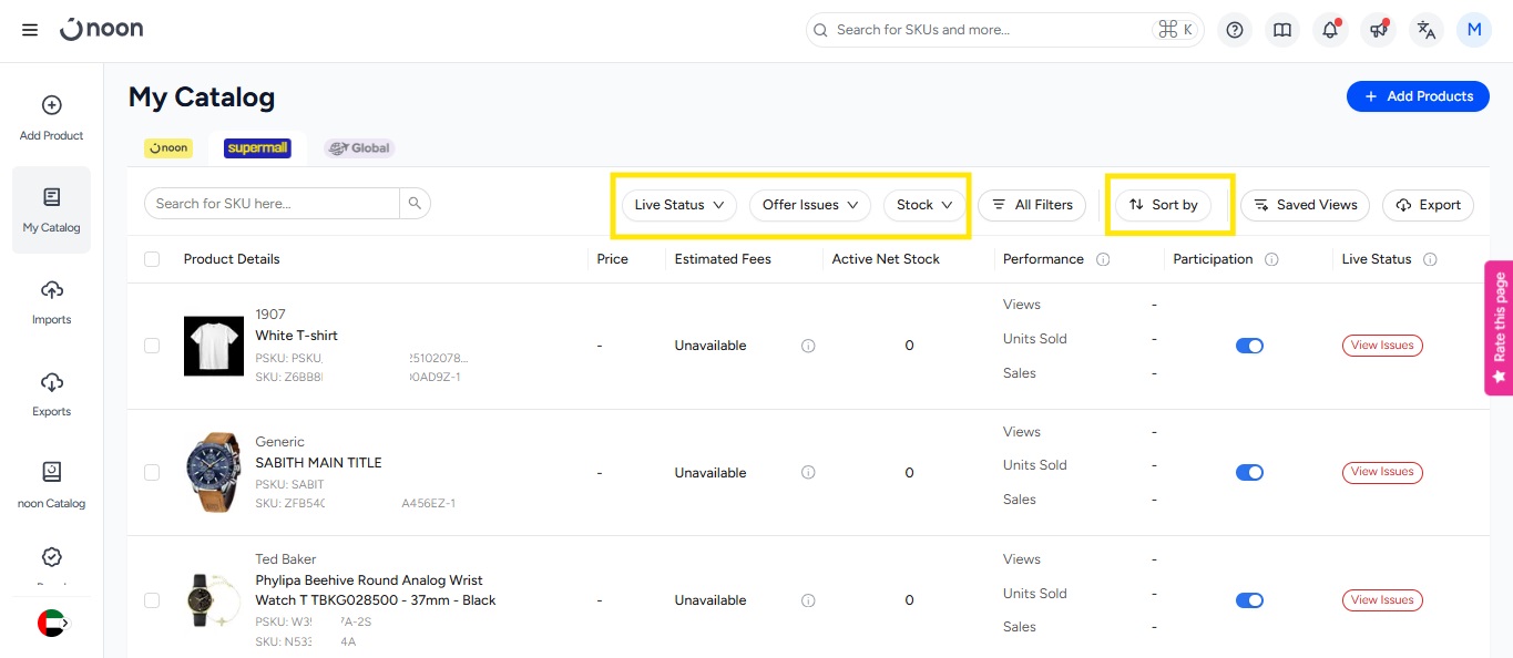 - Sort by Stock, Sales, Units sold, Product view and Price