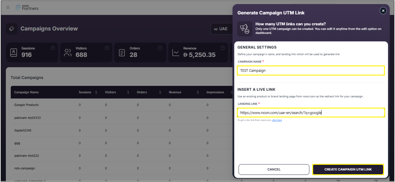 - A pop-up appears on the screen where you need to give a name for the campaign and the link where you want to redirect the traffic. Then click on Create Campaign UTM Link.