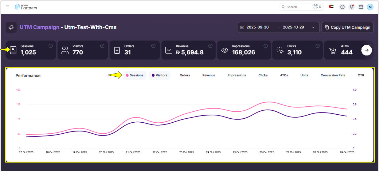 - You will be redirected to the performance page, where you can see the performance metrics at the campaign level at the top of this page. You can select the metrics in the performance graph to see the day-to-day performance.