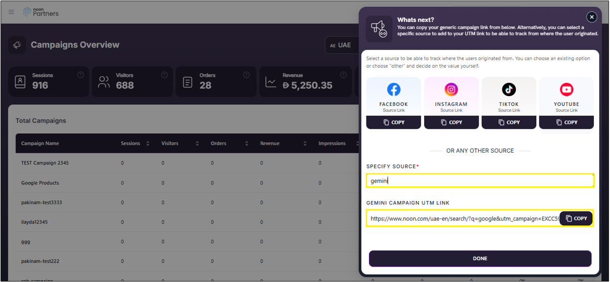 - If you further scroll down, you can give the source for which you want the link, and the system will generate the link below. You can copy the link and use it in your ads. Click on Done once the link is created.