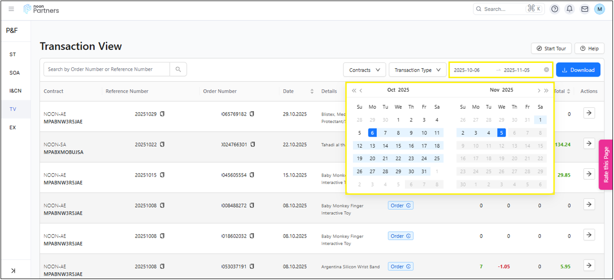 - In the Transaction View page, select the date range for which you want to extract the data.