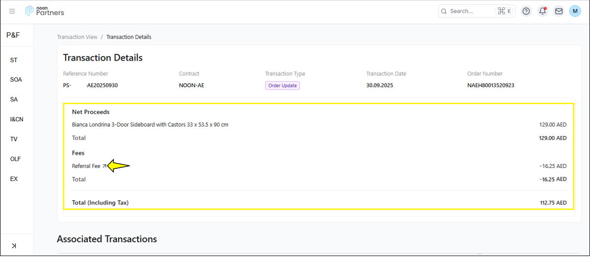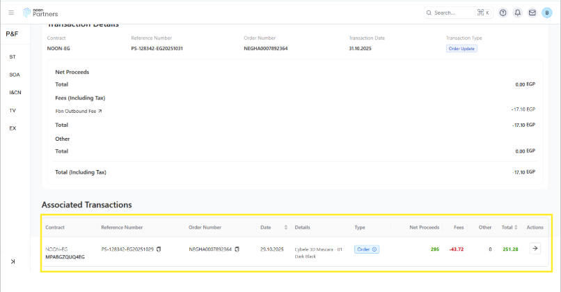 - If you further scroll down on the page, you will notice a section called Associated Transaction. This section shows all the transactions that happened for the same order such as any additional fees or returns from the customer.