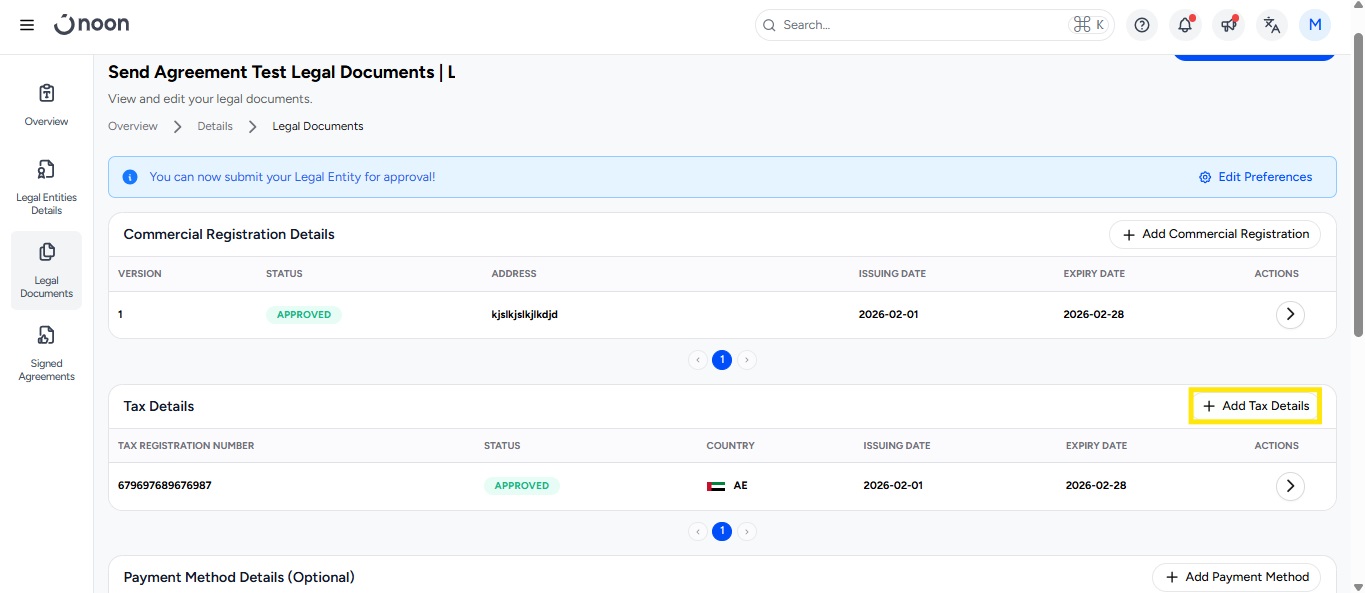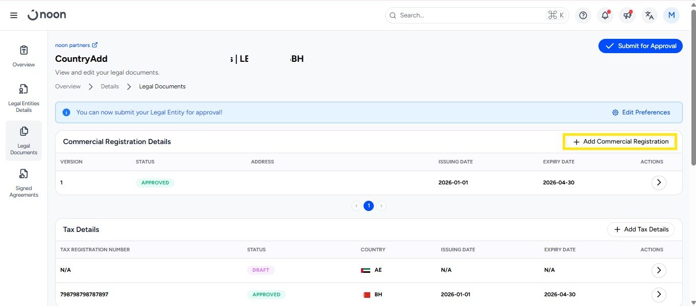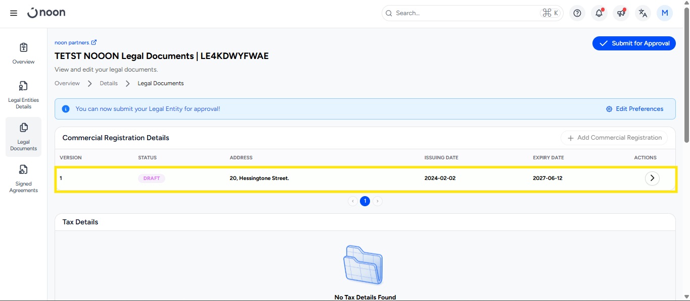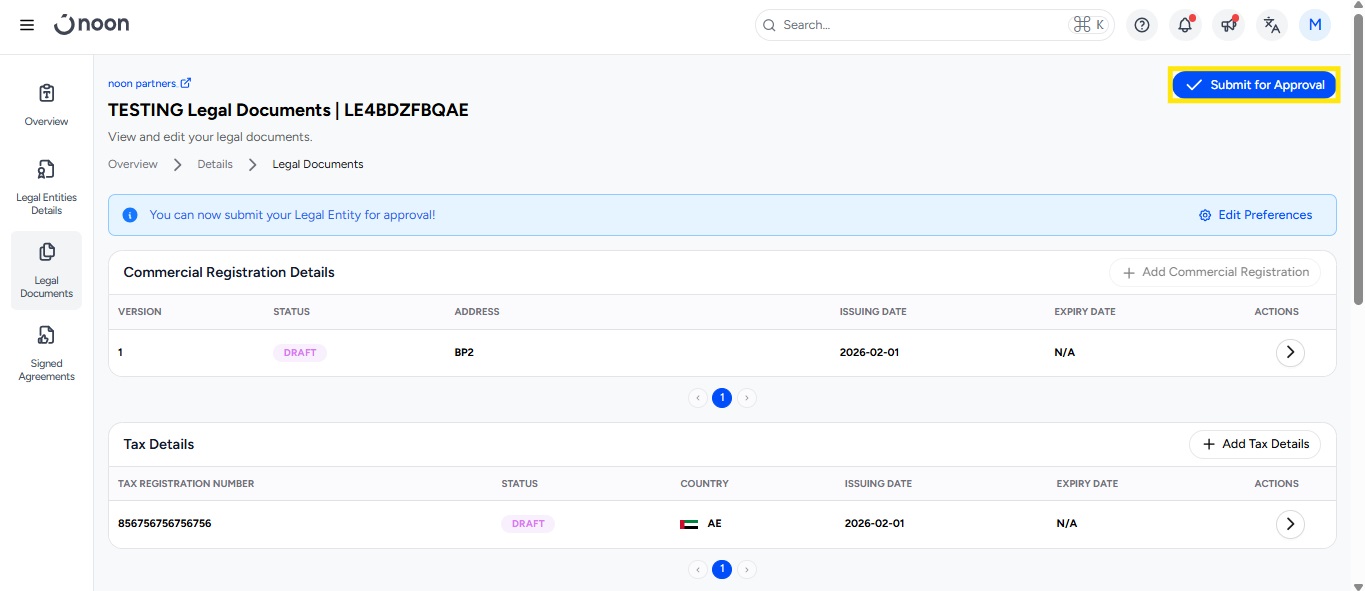 Legal Entity Status: Your Legal Entity will appear in “Draft” status.