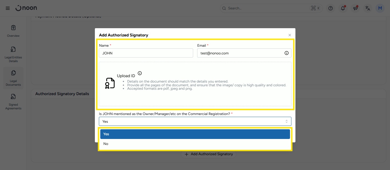- Click Add Authorized Signatory to enter details in the pop-up window.