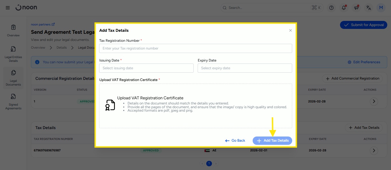 upload your VAT Registration Certificate, and click Add Tax Details.
