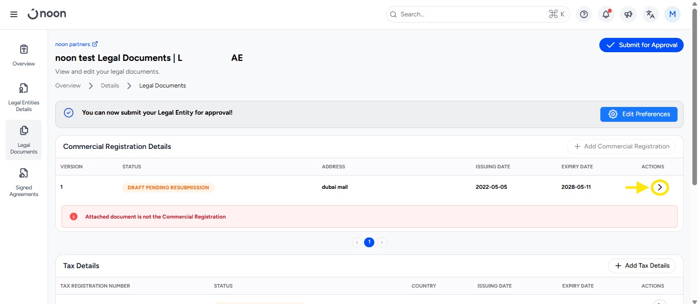 You will be directed to the Legal Entity page, where you can view the rejection reasons.