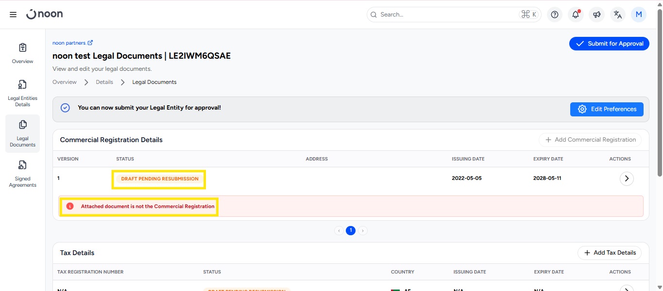 Your Legal Entity will be in the ‘Draft Pending Resubmission’ stage.