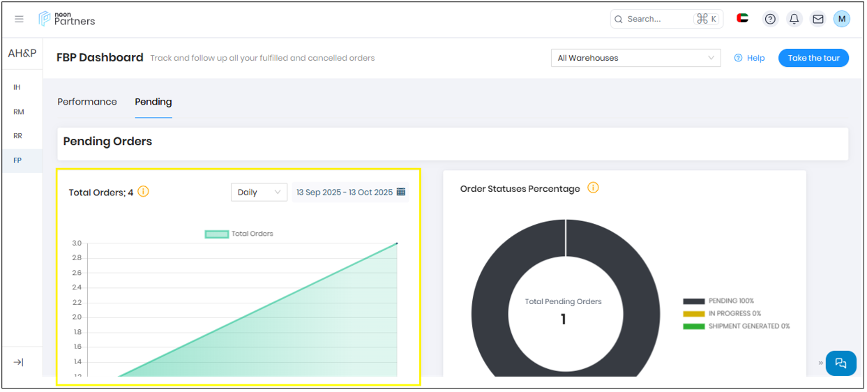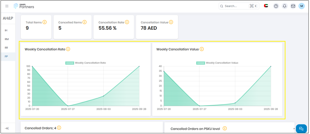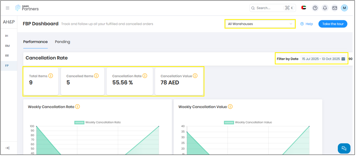 - Order Metrics: Total orders, cancellation rate, and value of cancelled orders. This data can be filtered by individual warehouses or viewed collectively.
