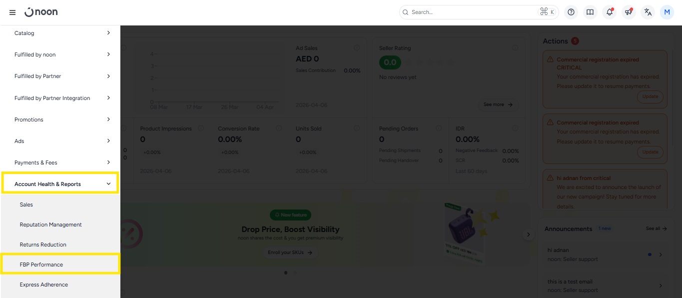 To access the FBP Performance Dashboard, open Seller Lab and click on Account Health and Report, then FBP Performance.