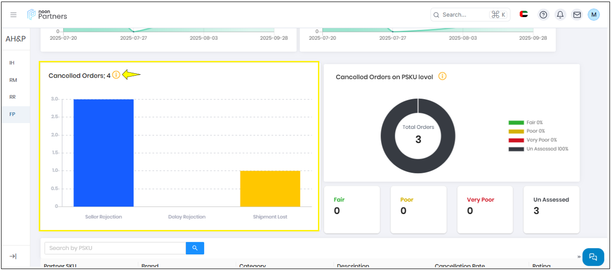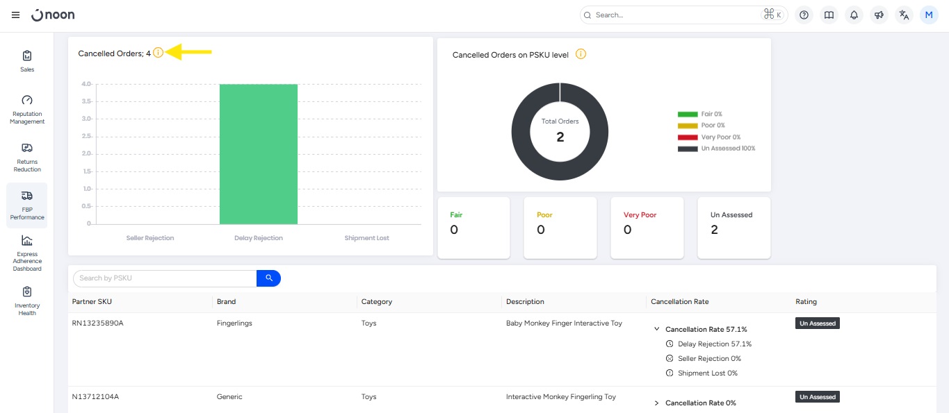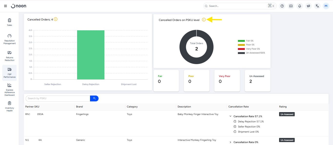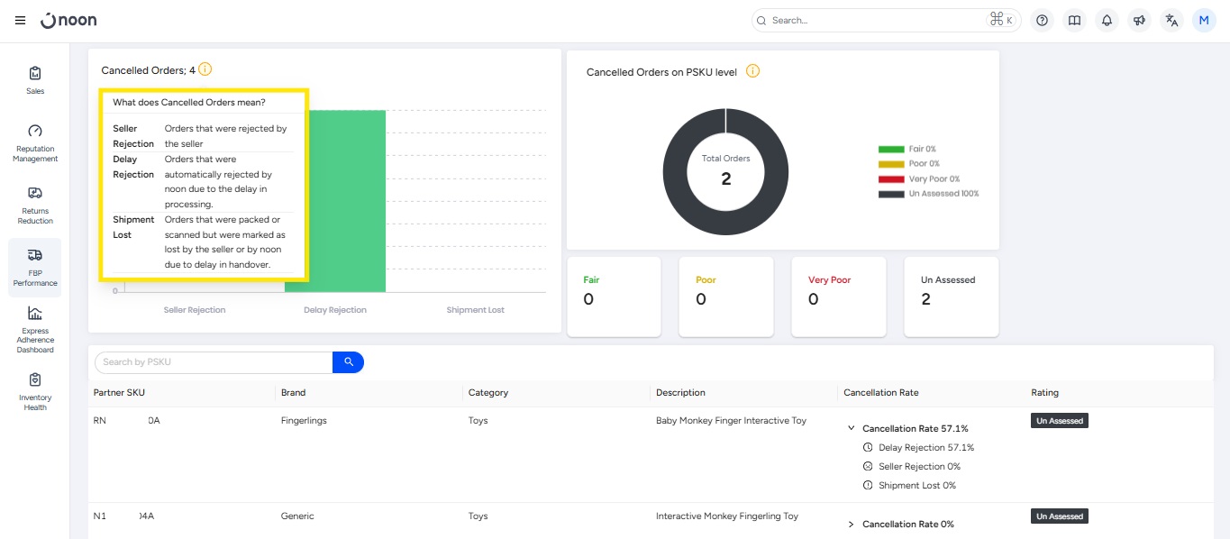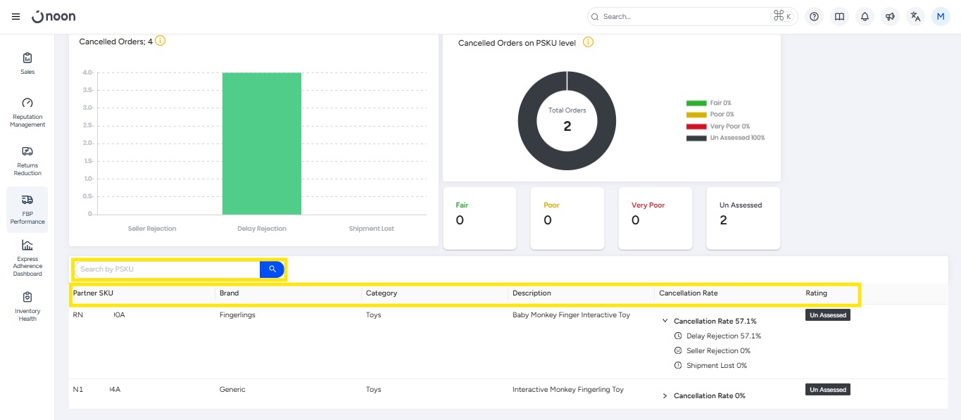- PSKU Details: List of PSKUs with details, cancellation rates, and rating tags, searchable via a search bar. There's an additional feature to view a breakdown of cancellation percentages by reason.