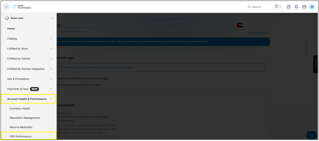 To access the FBP Performance Dashboard, open Seller Lab and click on Account Health and Performance, then FBP Performance.