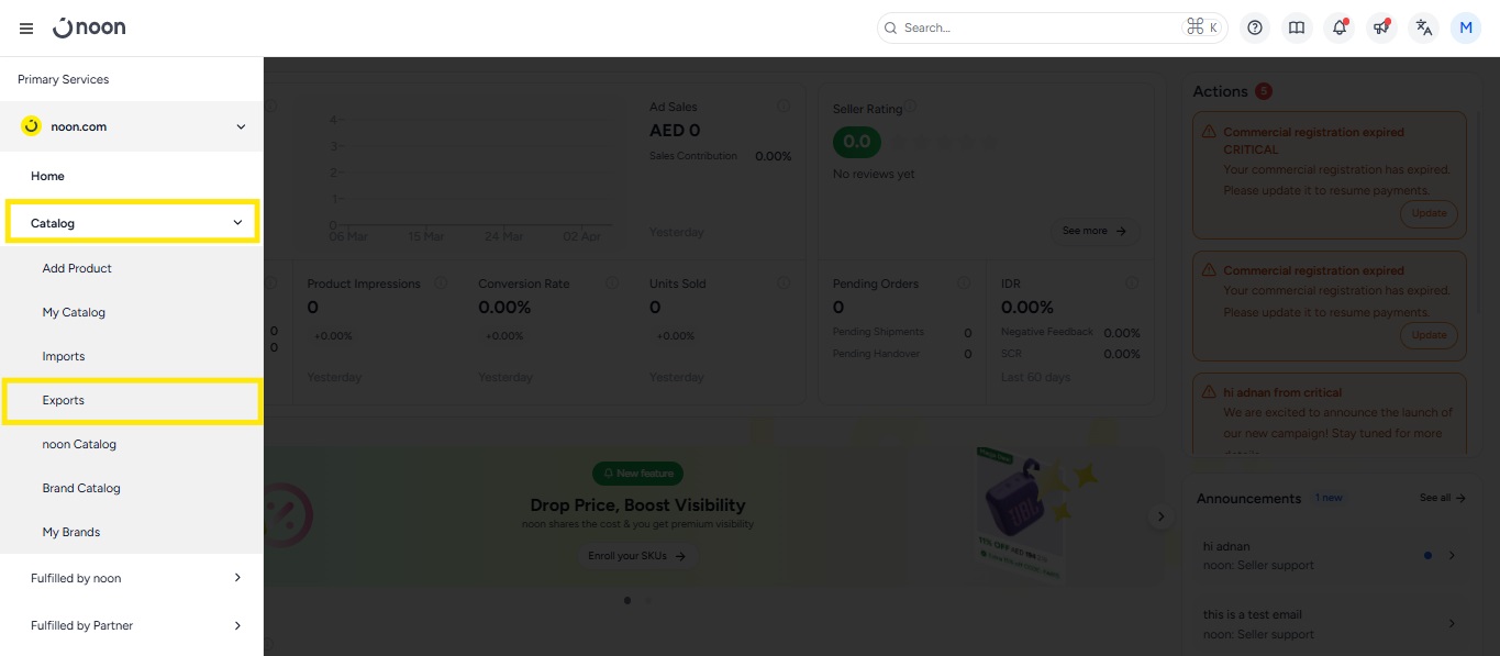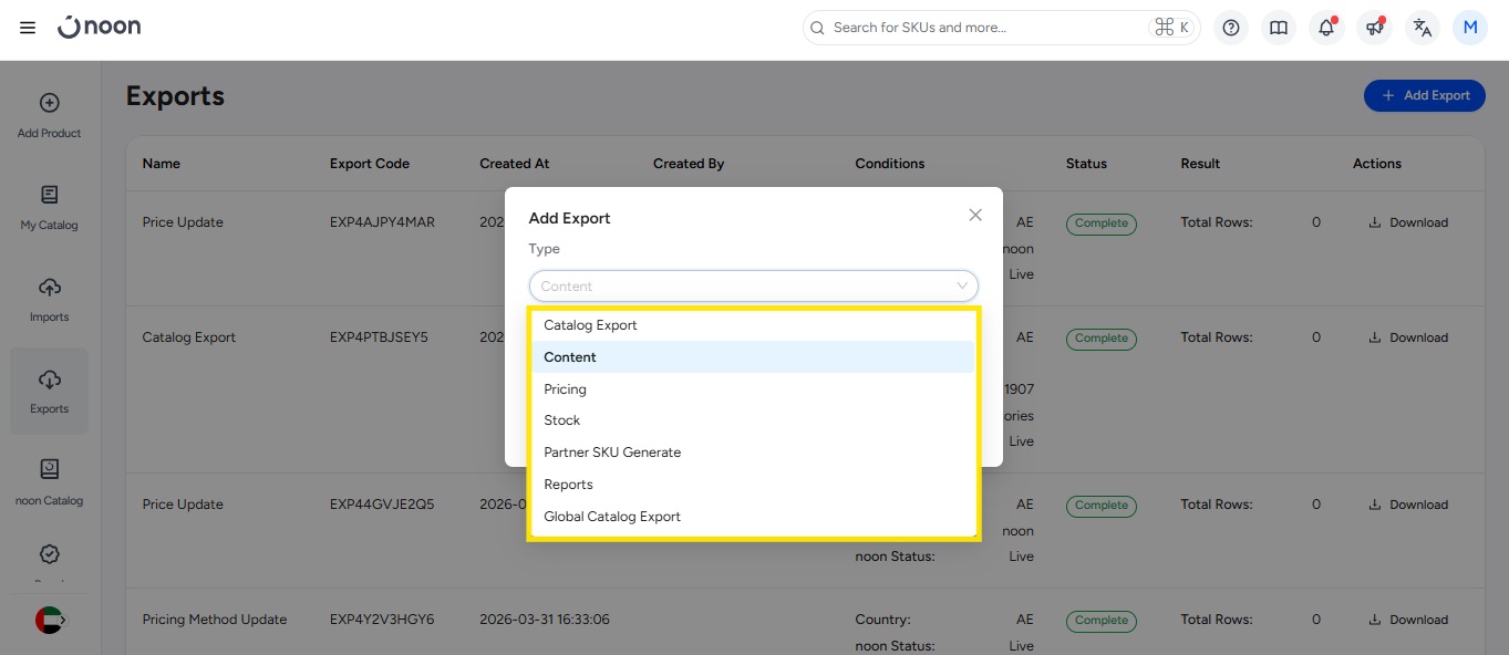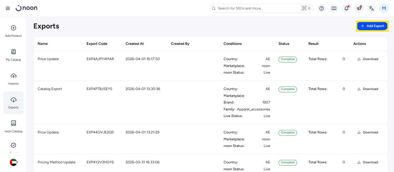 The noon Catalog has multiple templates & reports you can download from the Exports tab to help keep track of your products and prepare bulk imports: Listed below are the steps to access your exports: