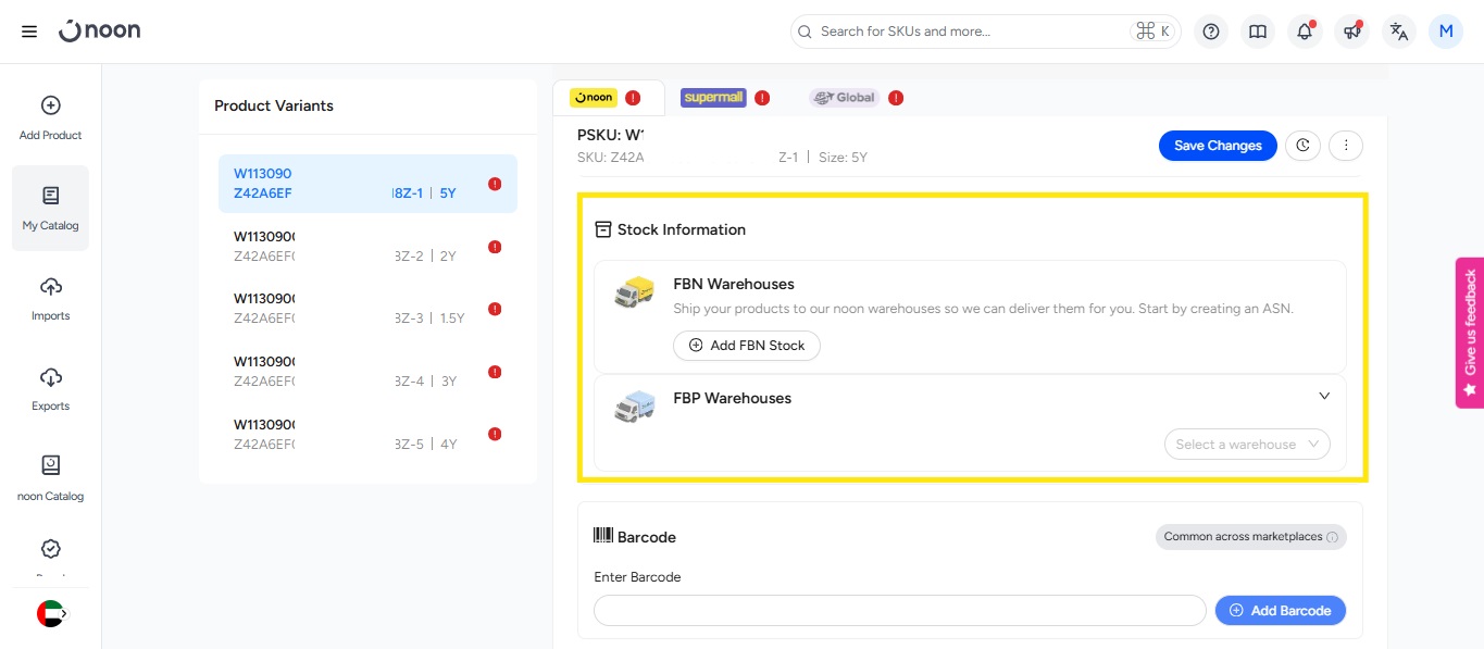 The noon Catalog acts as a product database and includes all items that have ever been sold on noon. Each product in the noon Catalog comes with pictures, description, and specifications. If your product is in the noon Catalog, you’ll be able to take it live immediately once you update your price, stock quantity, and barcodes. You have 2 process by which you can now list the item under noon catalog: