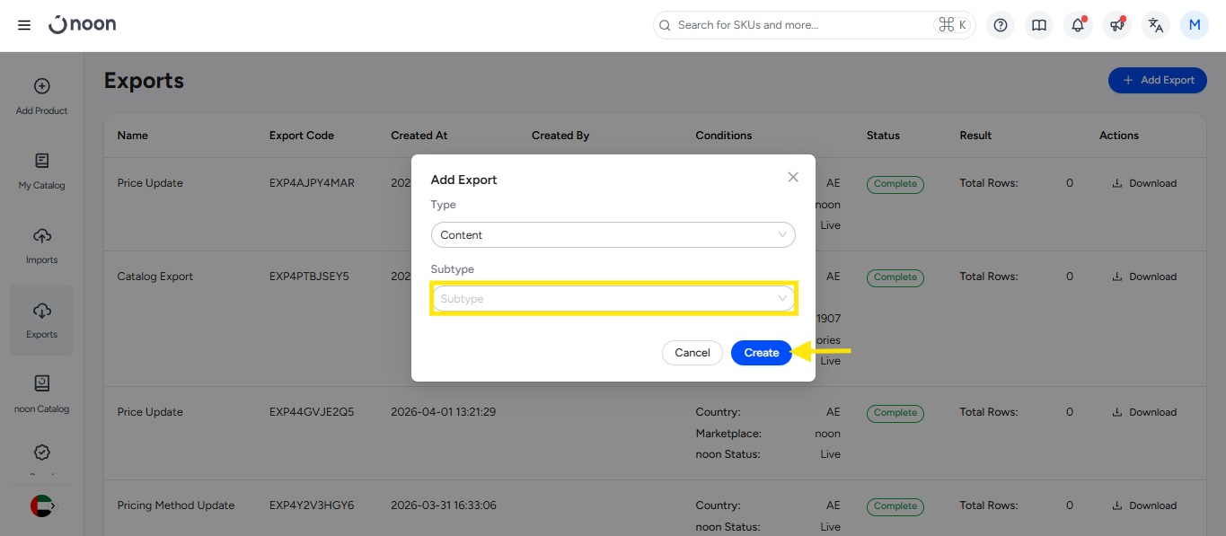 - Select Type and Subtype. Then, click on Create to request the export.