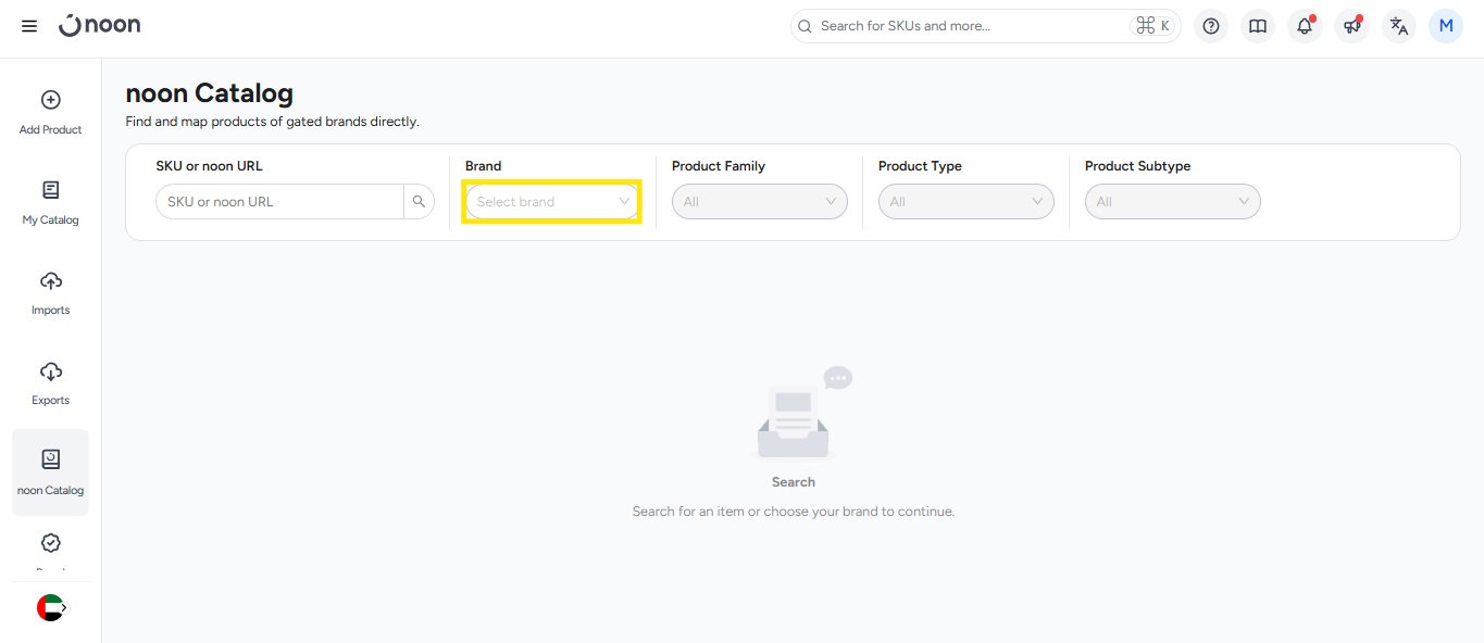 -For listing the item under the noon catalog with brand search option just search for a product you wish to sell in the noon Catalog by selecting the brand from the search option. Once you select the brand you will see all the item listed with noon under that specific brand.