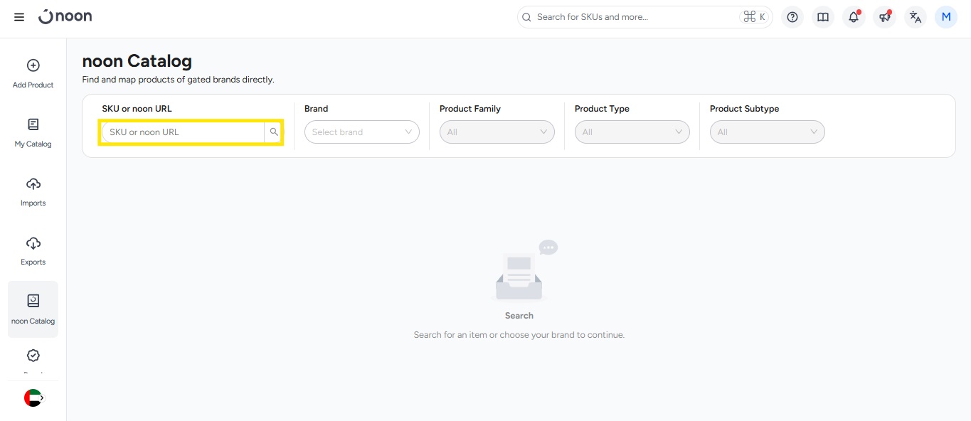 -For listing the item under the noon catalog with SKU search option just search for a product you wish to sell in the noon Catalog then search for the Brand