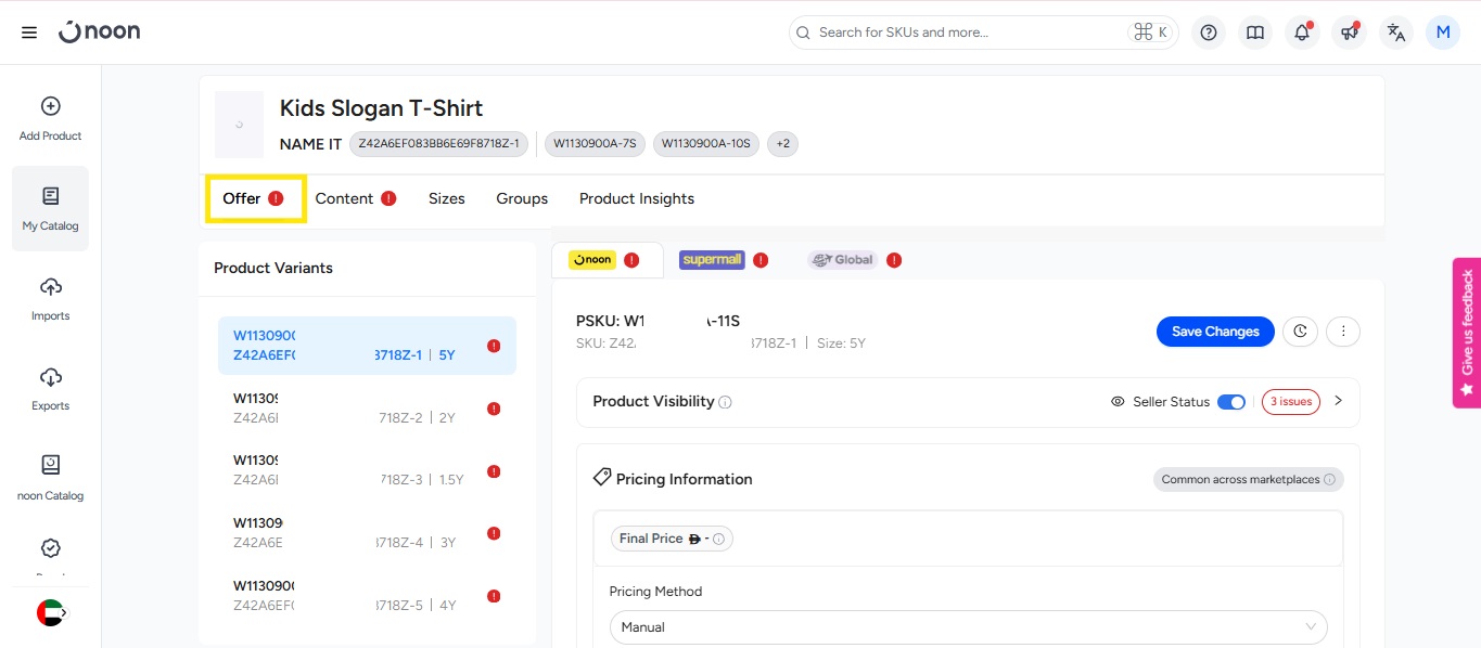-Now you can create or request noon to generate a PSKU and click on create button. Once the SKU is generated click on the PSKU hyperlink option which will take you to the offer page
